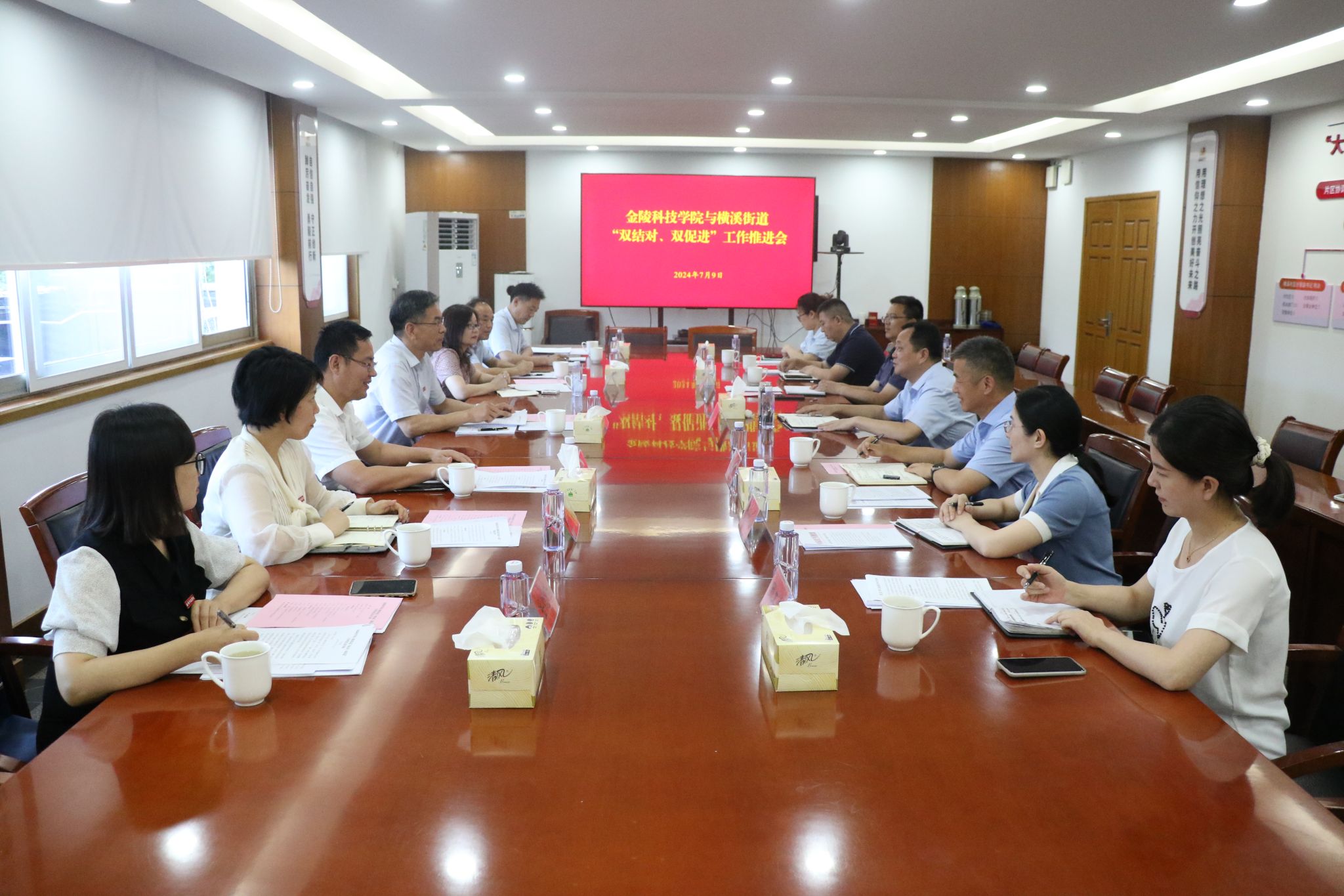 7月9日下午,校党委书记刘志远带领党委组织部、党委办公室、党委统战部、团委、园艺园林学院、动物科学与食品工程学院等部门、学院主要负责人到横溪街道开展“双结对、双促进”推进工作。横溪街道一级调研员、党工委书记、台创园党组书记詹军,党工委副书记马兴余,办事处副主任潘训国,党工委组织委员于丹凤以及党政办、组织办、宣传办、团工委等部门主要负责人参加推进会。