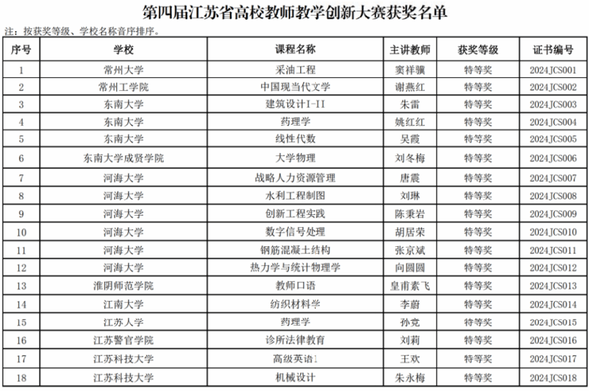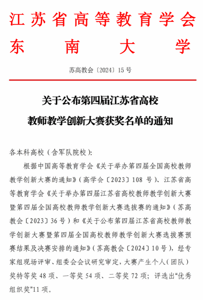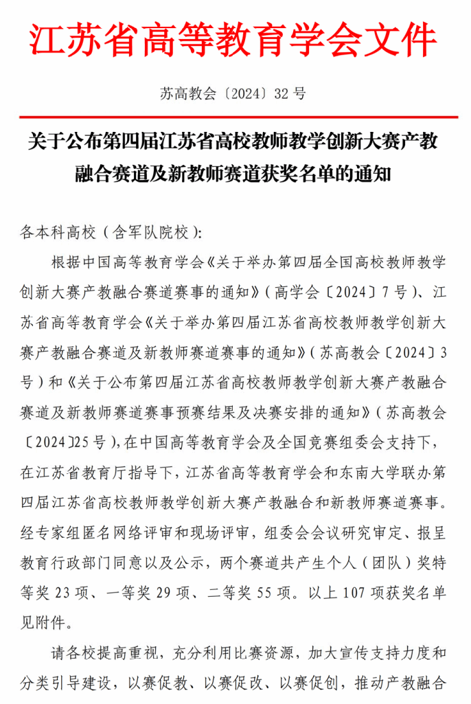日前,江苏省高等教育学会正式公布评审结果(苏高教会〔2024〕15号、苏高教会〔2024〕32号文),sjb世俱杯在第四届江苏省高校教师教学创新大赛(本科)暨第四届全国高校教师教学创新大赛选拔赛、第四届江苏省高校教师教学创新大赛产教融合赛道及新教师赛道中喜获佳绩。艺术学院范丽、建筑工程学院李恩康、机电工程学院智淑亚、理学院朱心阳4位老师经过激烈角逐后,分别荣获产教融合赛道一等奖、新教师赛道一等奖、正高组二等奖、中级及以下组二等奖。