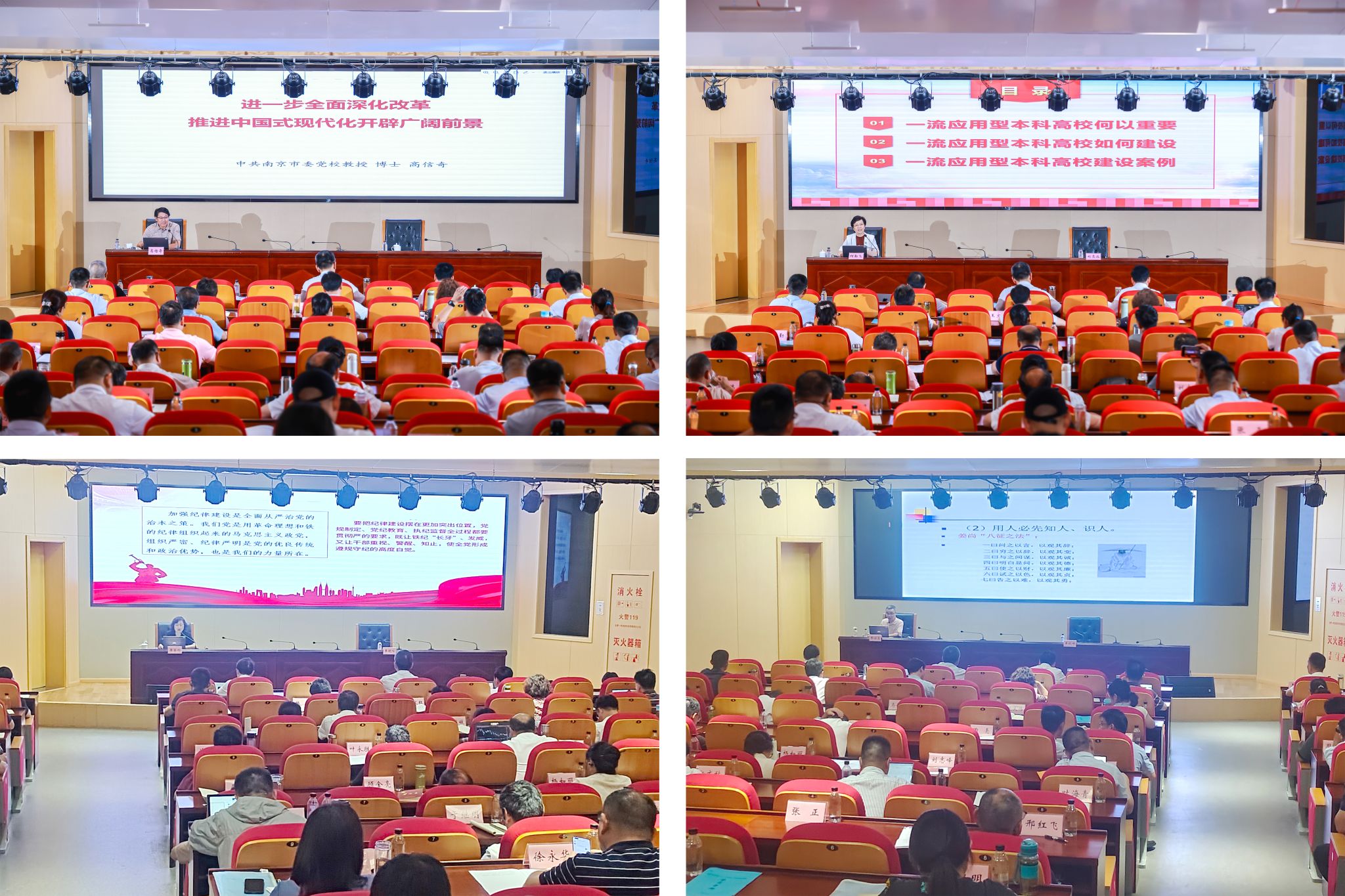 本次培训邀请了上海应用技术大学原校长柯勤飞教授以《应用创新 特色发展 加快建设一流应用型本科高校》为题、中共南京市委党校高信奇教授以《进一步全面深化改革推进中国式现代化开辟广阔前景》为题、中共江苏省委党校彭安玉教授以《走向卓越的领导艺术》为题、中共江苏省委党校唐金玲教授以《全面加强党的纪律建设》为题,分别作专题辅导报告。报告会由校党委副书记单晓峰主持。