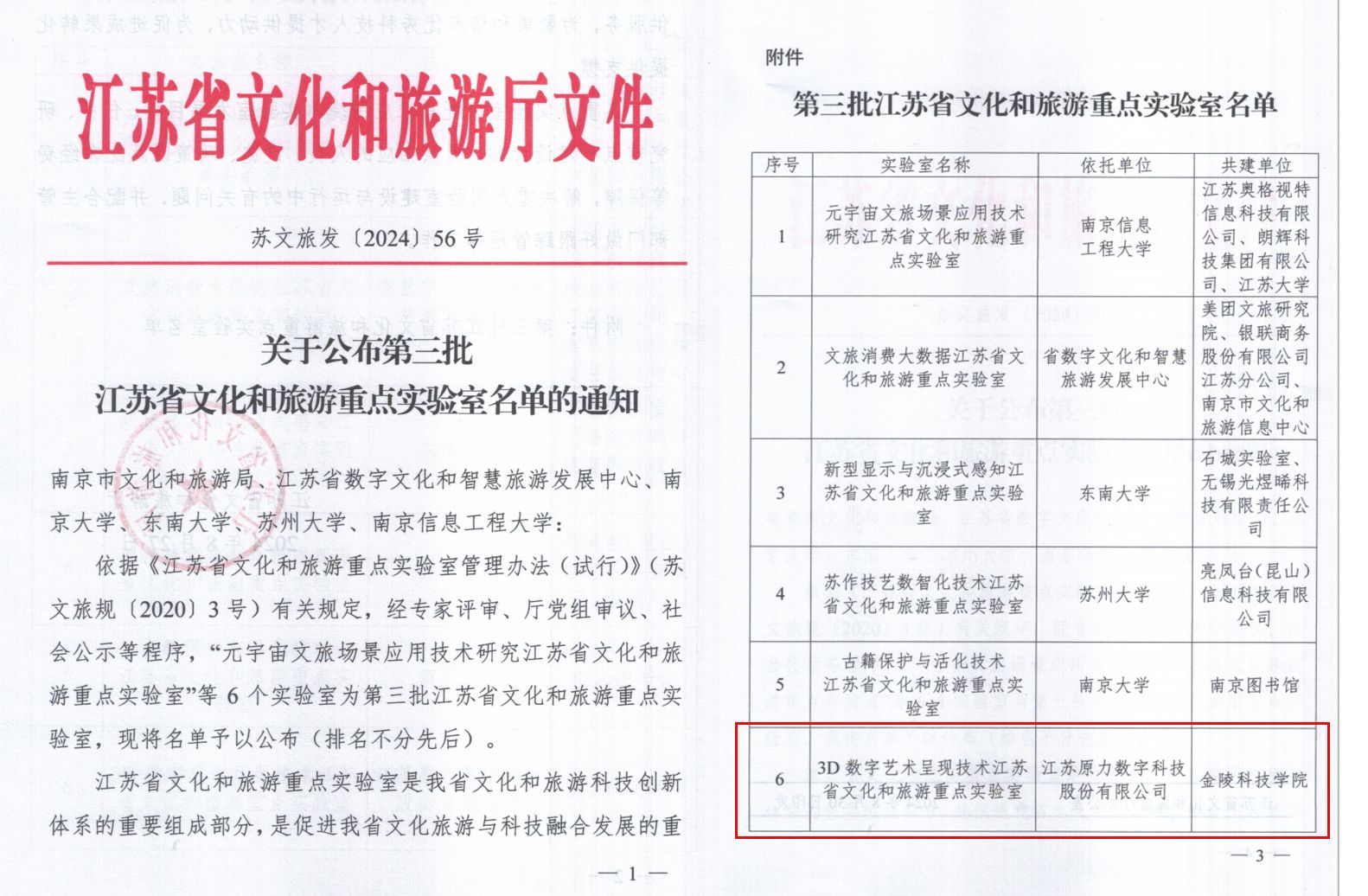 近日,江苏省文化和旅游厅公布了第三批江苏省文化和旅游重点实验室认定名单,sjb世俱杯作为共建单位和江苏原力数字科技股份有限公司共同申报的“3D数字艺术呈现技术江苏省文化和旅游重点实验室”成功获批,是此次获认定的6家单位之一。