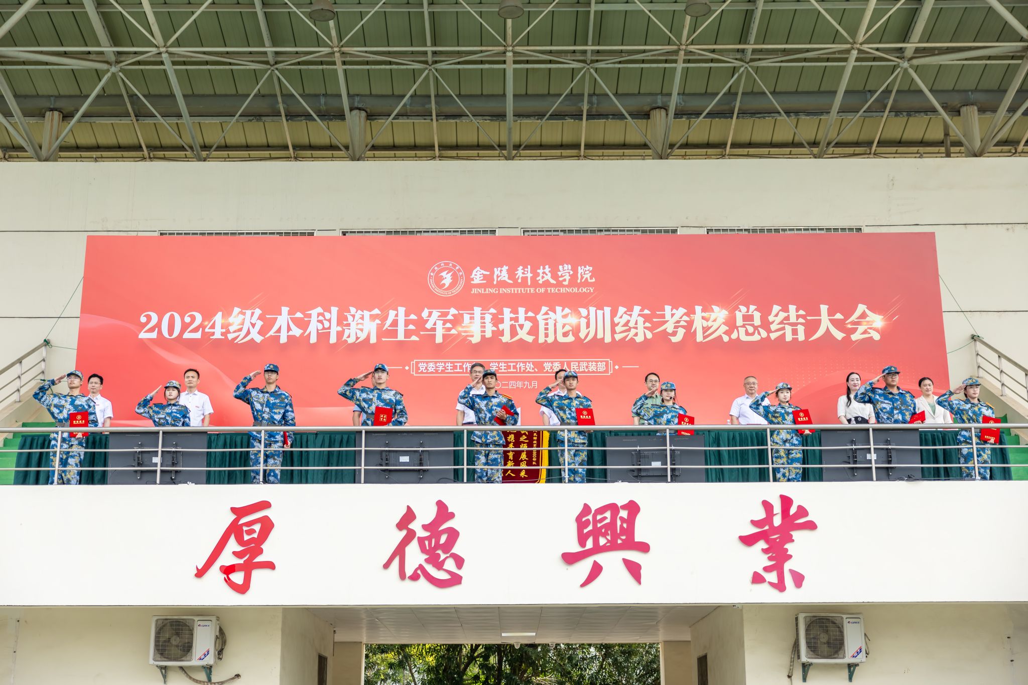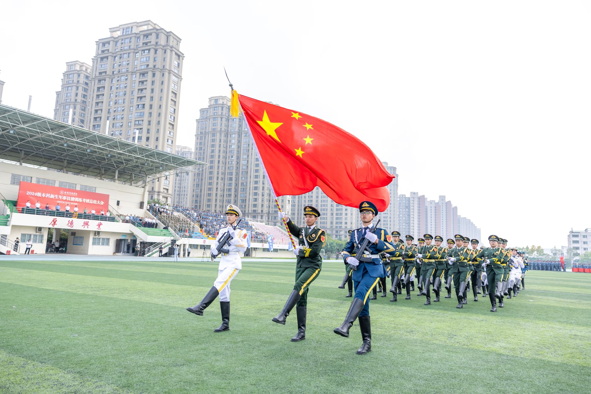 在中华人民共和国迎来75周年华诞之际,sjb世俱杯举行2024级本科新生军事技能训练考核总结大会,既是军训成果的展示,也是向祖国的献礼。通过14天军训生活的洗礼,同学们厚植了爱国情怀,增强了体质,磨练了意志,塑造了奋发向上、坚韧顽强的精神品格。相信在未来的日子里,2024级金科学子将继续发扬军训期间的优良作风和顽强拼搏的精神,在新起点上用奋斗之行书写人生答卷,在新征程上以青春之我践行强国誓言。