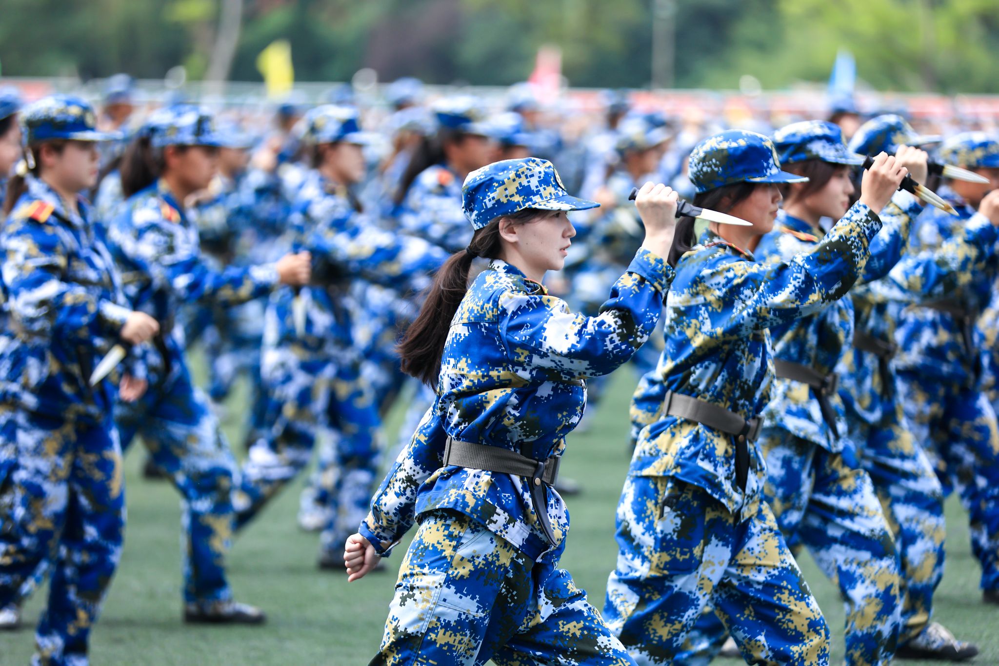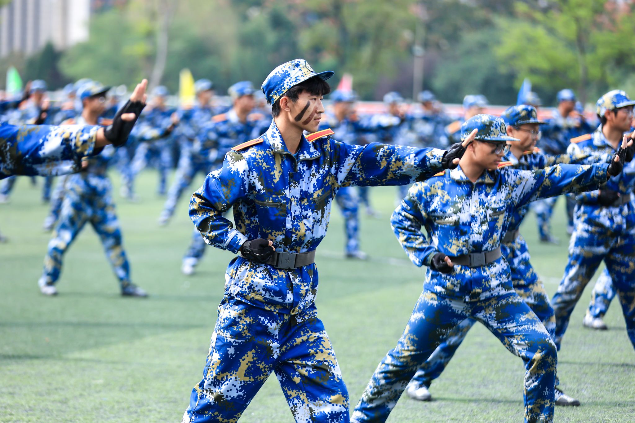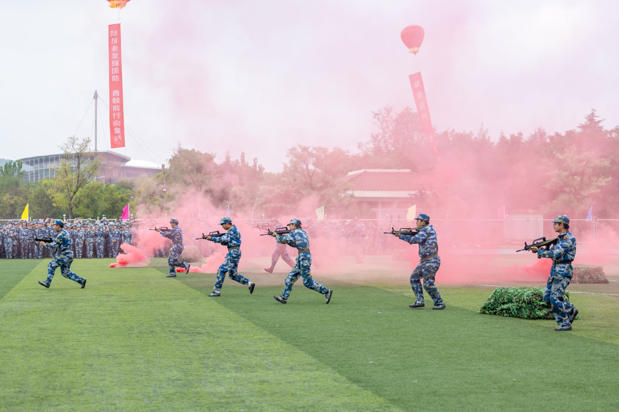 五星红旗冉冉升起,国歌旋律激扬回荡。随着刘志远下达“开始”指令,2024级本科新生军事技能训练考核总结大会正式拉开序幕。各学院分列式方阵依次通过主席台,同学们步伐整齐,口号响亮,身姿挺拔,展示出良好的军事训练效果,尽显朝气蓬勃的青春活力。一曲铿锵激昂的《中国军魂》响起,600名金科学子组成的方阵变化出“2024”“金科”“为党育人”“为国育才”以及倒计时的字样。模拟战场救护中同学们展示了创伤急救、外伤包扎、心肺复苏等基本救护技能。擒敌拳、匕首操,一招一式行云流水,一进一退攻守兼备,极具视觉冲击。“沉浸式”战术演练使人身临其境,模拟战场狼烟滚滚,将现场气氛推向高潮。