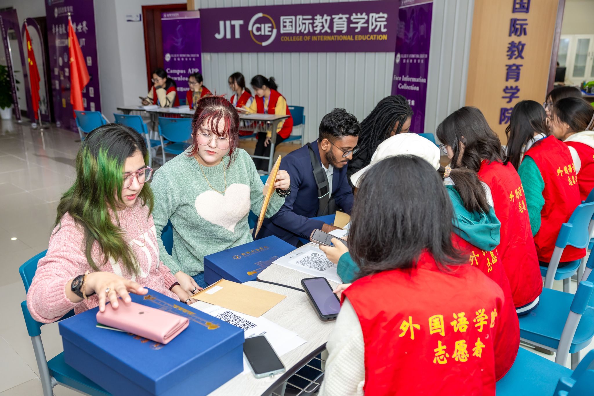 迎新现场,科技楼3号楼5楼设置了集中报到区域,分设收集审核材料、办理电话卡、安装及培训使用校园生活类APP等多项服务窗口,为新生提供了一站式便捷服务。来自外国语学院的志愿者们热心帮助新生安排宿舍入住,讲解报到流程,及时答疑解惑,指引新生完成报到注册手续,给他们留下真挚美好的“金科初印象”。