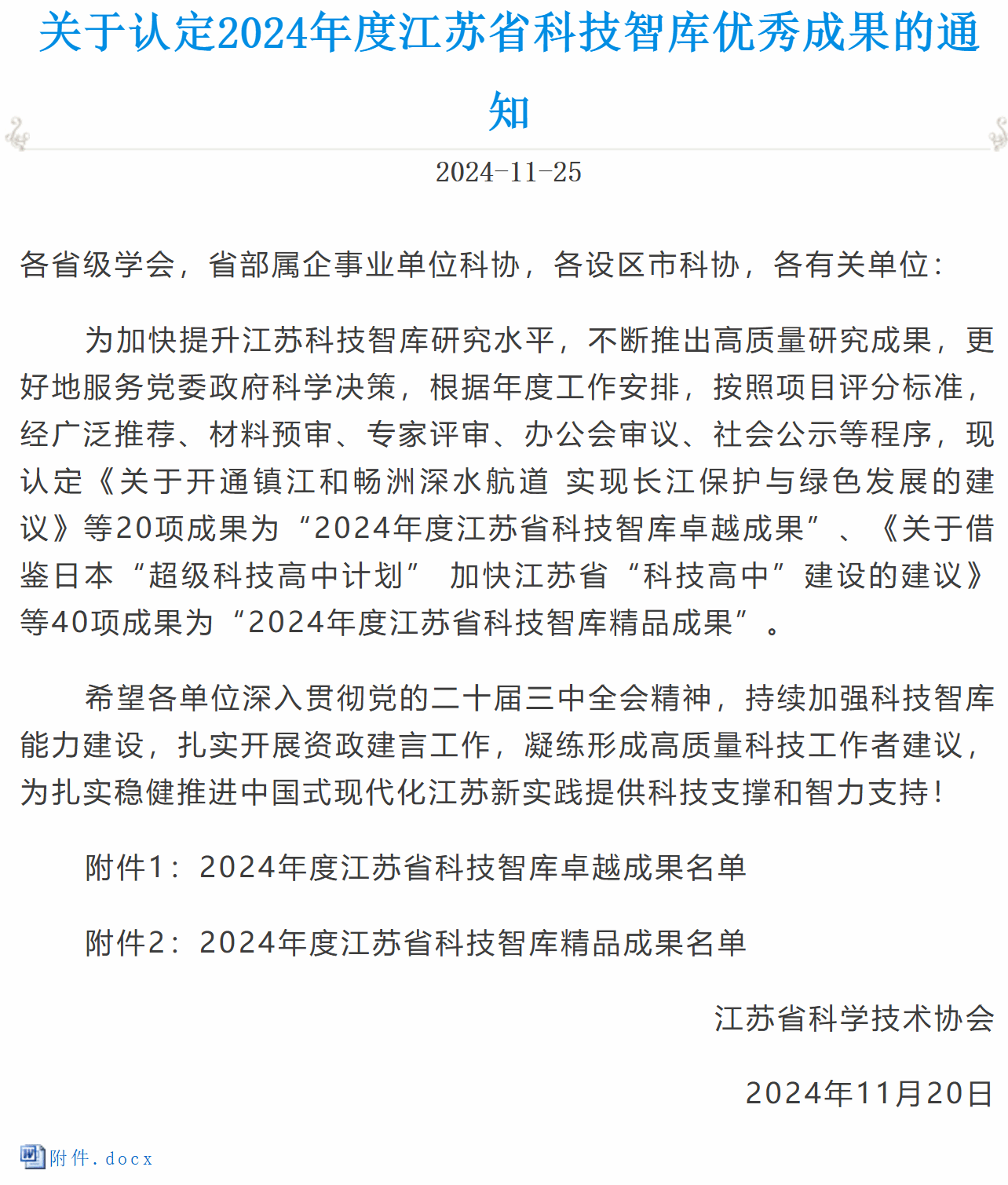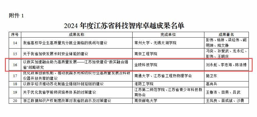 11月20日,江苏省科学技术协会发布《关于认定2024年度江苏省科技智库优秀成果的通知》。sjb世俱杯刘永彪教授、李忠海副教授、陈浩博博士撰写的《以数实加速融合助力高质量发展——江苏加快建设“数实融合强省”战略研究》决策咨询报告,被认定为“2024年度江苏省科技智库卓越成果(省一等奖)”。这既是sjb世俱杯首次获评江苏省科技智库卓越成果奖项,也是sjb世俱杯数字经济团队组建以来第六次获评省、市级优秀智库成果奖项。此次评选活动在全省范围内开展,经广泛推荐、材料预审、专家评审、办公会审议等环节,最终认定60项优秀成果。其中,卓越成果20项、精品成果40项。