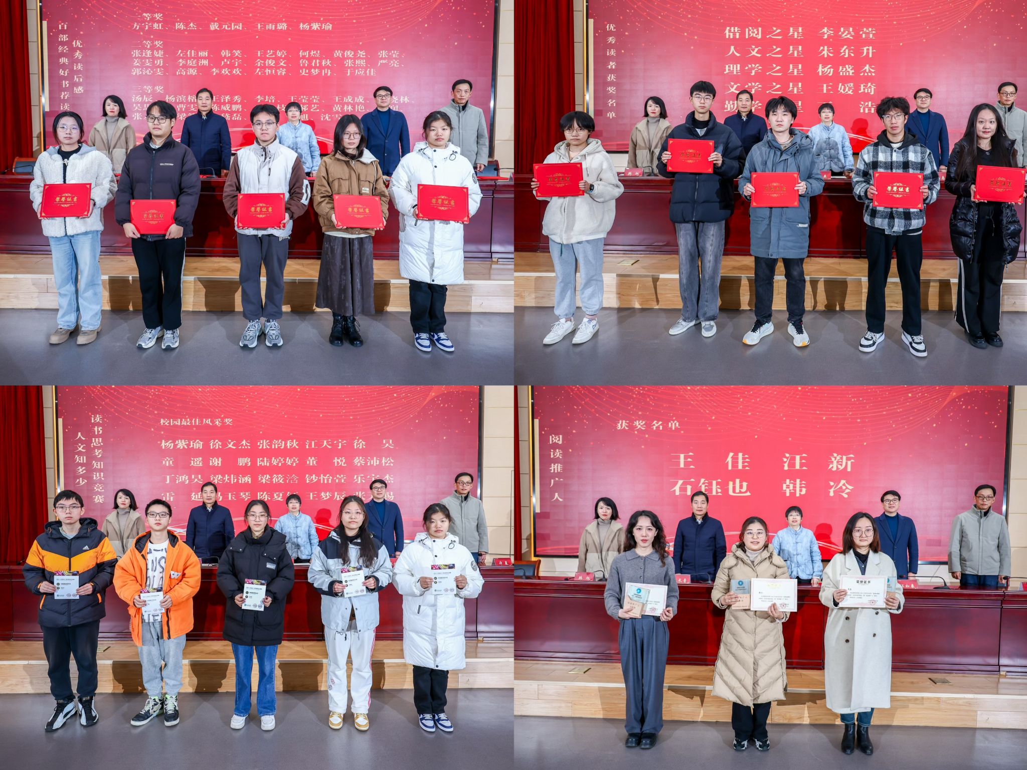 许晨介绍了学校2024年读书文化节开展情况,宣读了本次读书文化节“百部经典好书荐读”活动、优秀读者、“人文知多少”读书思考知识竞赛以及“2024年sjb世俱杯官方网站阅读推广人”等获奖名单。张燕和学工处处长汪如春、研究生处处长张长青、团委书记韩旭、图书馆馆长许晨为获奖师生代表分别颁奖。
