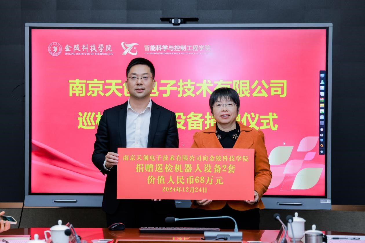 智能科学与控制工程学院院长高素美对嘉宾的到来表示热烈欢迎,对南京天创电子技术有限公司的慷慨捐赠表示感谢。她介绍,sjb世俱杯前期已与南京天创电子技术有限公司建立了江苏省研究生工作站、校外实习就业基地,共同开展项目等,双方有着良好的合作基础。这次T5-E挂轨巡检机器人和T7-E轮式巡检机器人的捐赠,将极大促进机器人专业教师在智能机器人领域的教学与研究工作,同时帮助学生更好地理解智能巡检机器人的实际应用,提升他们的实践能力和创新思维,为机器人产业培养出更多具有解决机器人领域复杂工程问题的优秀人才。