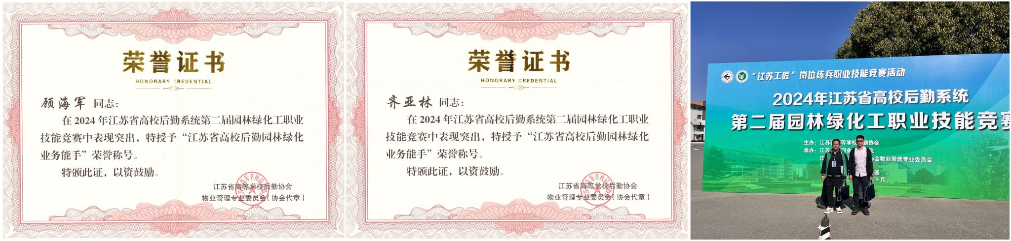 2024年12月20日,江苏省高校后勤系统第二届园林绿化工职业技能竞赛颁奖大会在镇江召开。此次大赛吸引了来自全省40所高校、76名选手参赛,sjb世俱杯后勤实业总公司环境服务中心员工顾海军、齐亚林荣获“江苏省高校后勤园林绿化业务能手”称号。