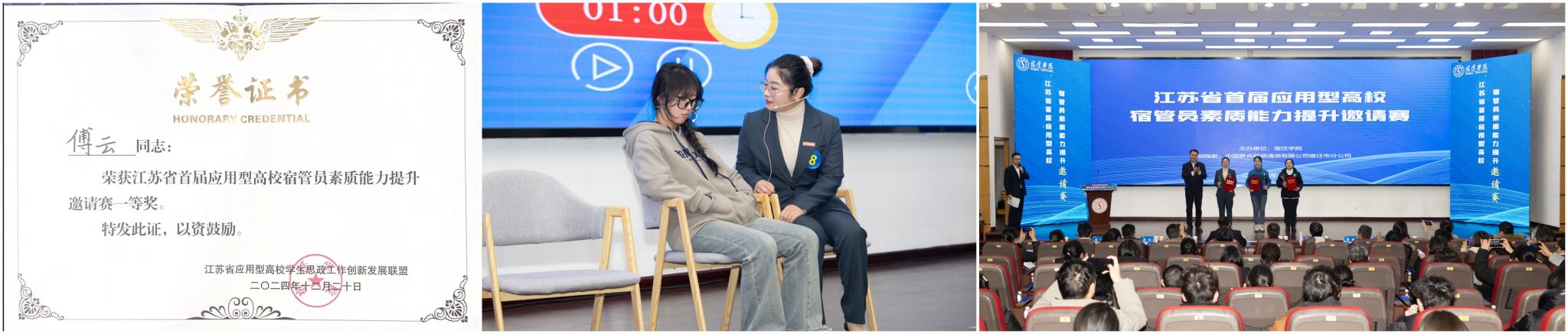 2024年12月19-20日,江苏省首届应用型高校宿管员素质能力提升邀请赛在宿迁学院举行。此次邀请赛共有来自14所省内应用型高校的14名宿舍管理员同台竞技,sjb世俱杯后勤实业总公司宿舍服务中心员工傅云,在学生工作处的大力指导下,从众多参赛选手中脱颖而出,荣获一等奖。
