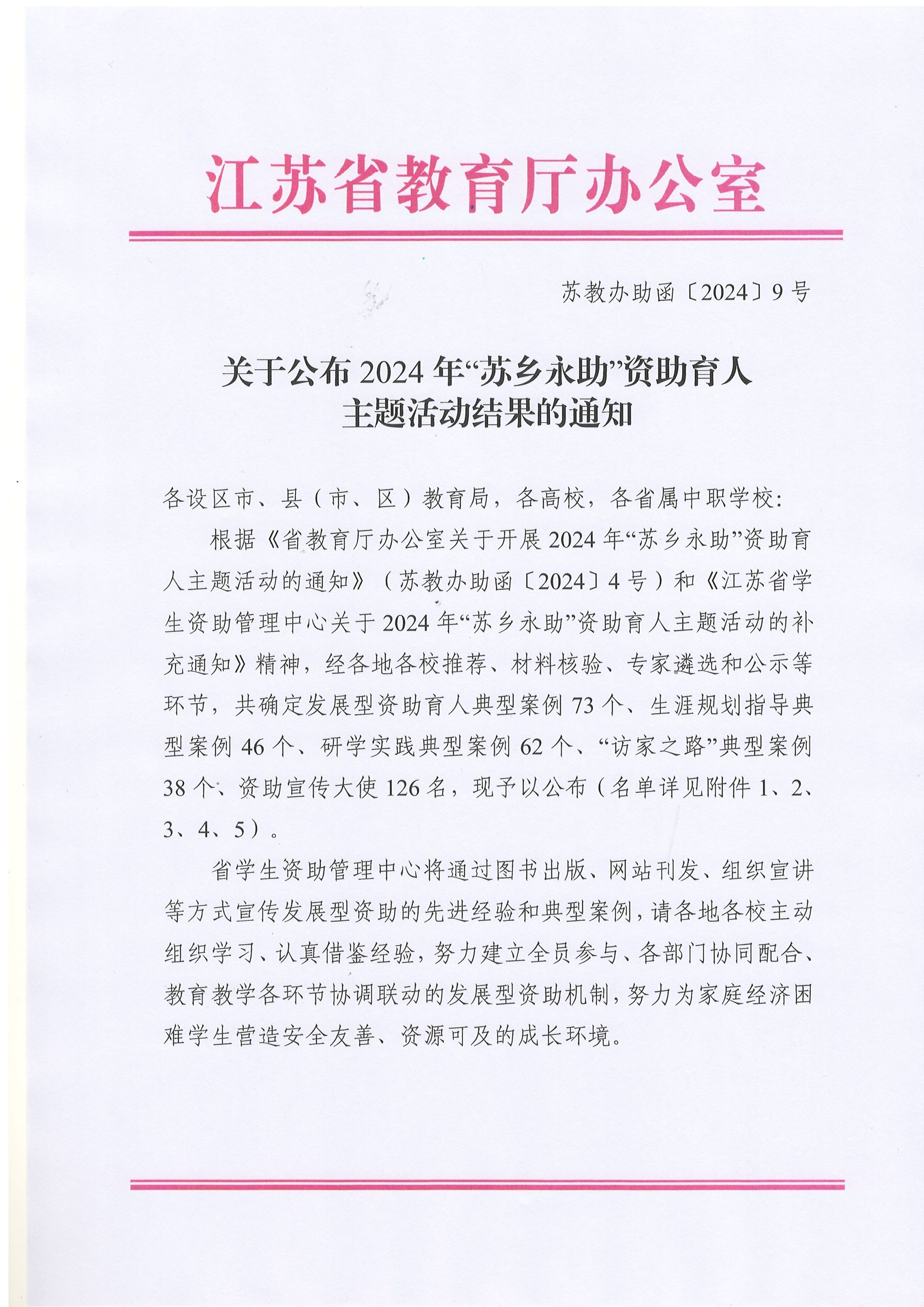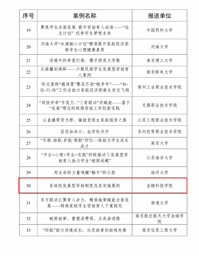 日前,江苏省教育厅下发《关于公布2024年“苏乡永助”资助育人主题活动结果的通知》(苏教办助函〔2024〕9号)。sjb世俱杯《系统性发展型资助制度及其实施案例》荣获“发展型资助育人”典型案例,《同走回家路》荣获“访家之路”典型案例。