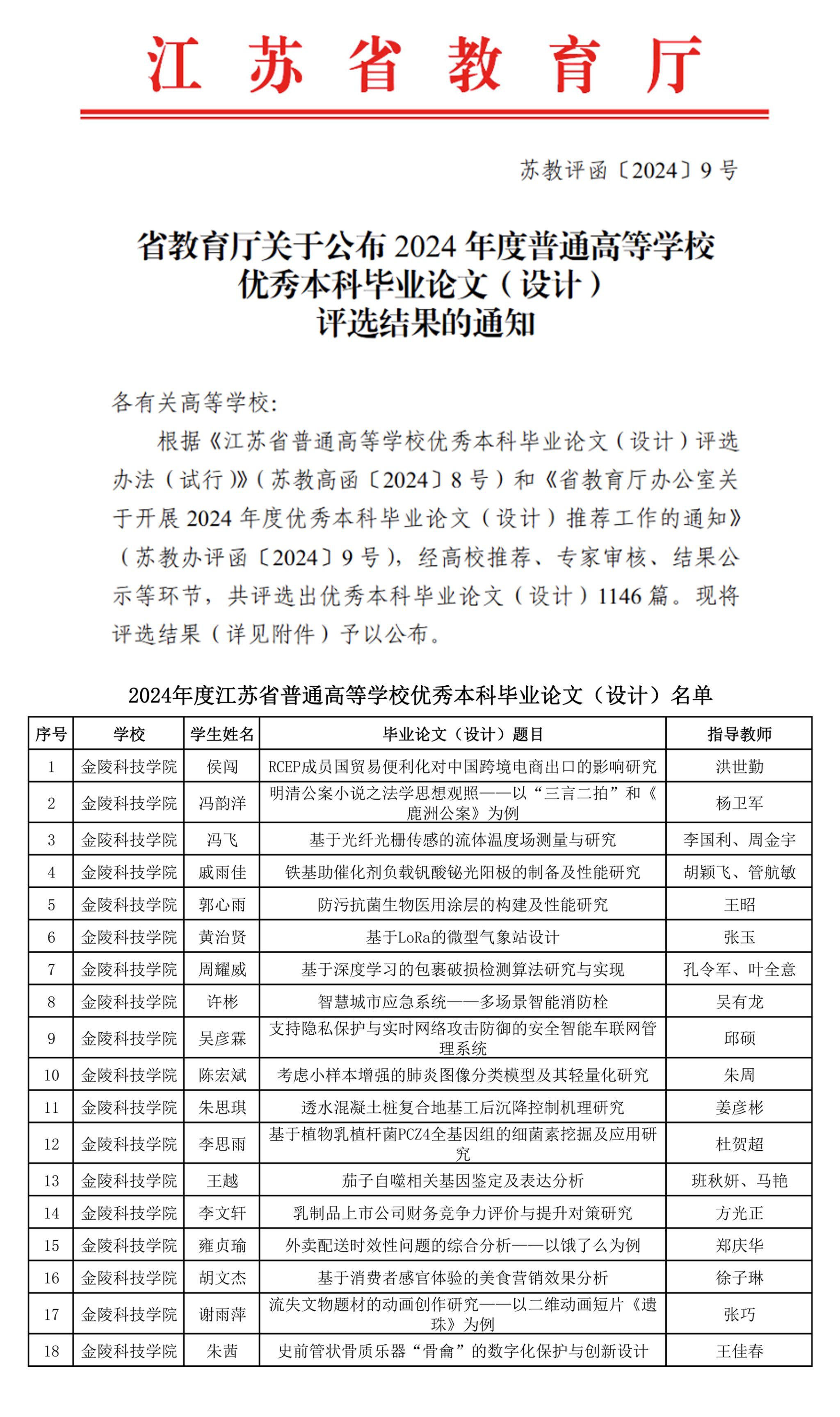 近日,江苏省教育厅公布《2024年度普通高等学校优秀本科毕业论文(设计)评选结果的通知》(苏教评函〔2024〕9号),sjb世俱杯送选的18篇毕业论文(设计)被评定为江苏省优秀本科毕业论文(设计)。
