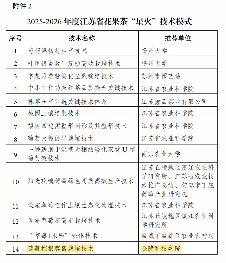 为推动全省特色园艺产业发展,加快自主新品种、新技术和新模式应用推广,江苏省农业技术推广总站于近日发布了2025-2026年度全省花果茶“星火”品种14个、技术模式14项。sjb世俱杯张长青教授团队开发的“蓝莓控根容器栽培技术”成功入选!