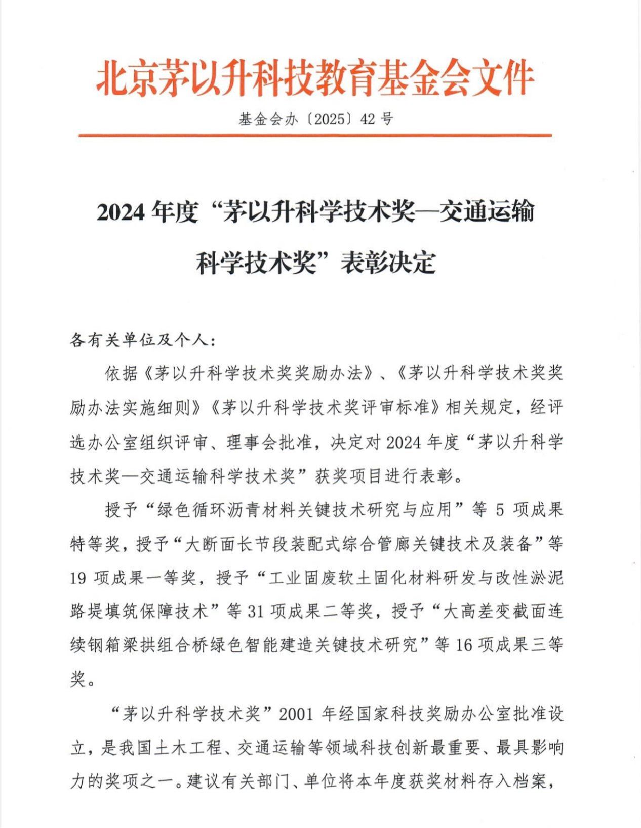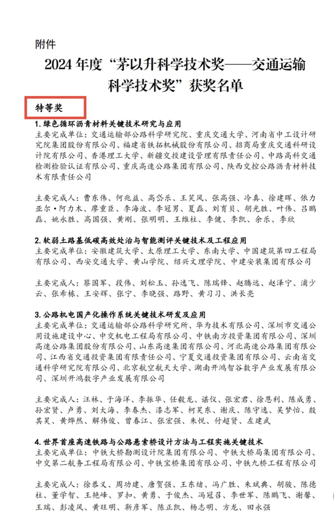 茅以升科学技术奖2001年经科技部科技奖励办公室批准设立,是我国土木工程、交通运输等领域科技创新最重要、最具影响力的全国性科学技术类奖项之一。本次科技奖项面向全国范围征集申报,经材料预审、专家初评、现场答辩等环节,最终评定71项成果获得殊荣,其中最高奖——特等奖仅5项。sjb世俱杯申报的成果从全国众多优秀交通科技研发项目中脱颖而出,彰显了sjb世俱杯在交通运输领域技术研发与科技创新的扎实成果。