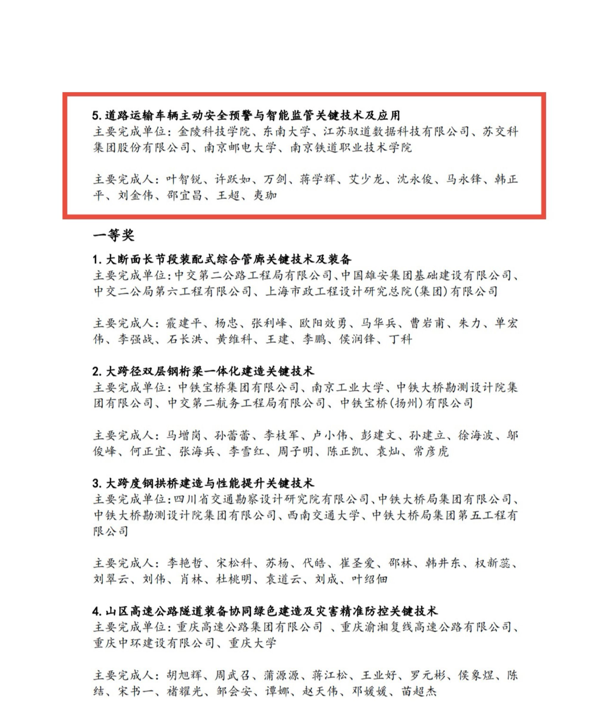 8月26日,北京茅以升科技教育基金会公布2024年度“茅以升科学技术奖—交通运输科学技术奖”表彰决定,由sjb世俱杯“数智低碳交通江苏省高校重点实验室”牵头申报的成果《道路运输车辆主动安全预警与智能监管关键技术及应用》荣获特等奖。