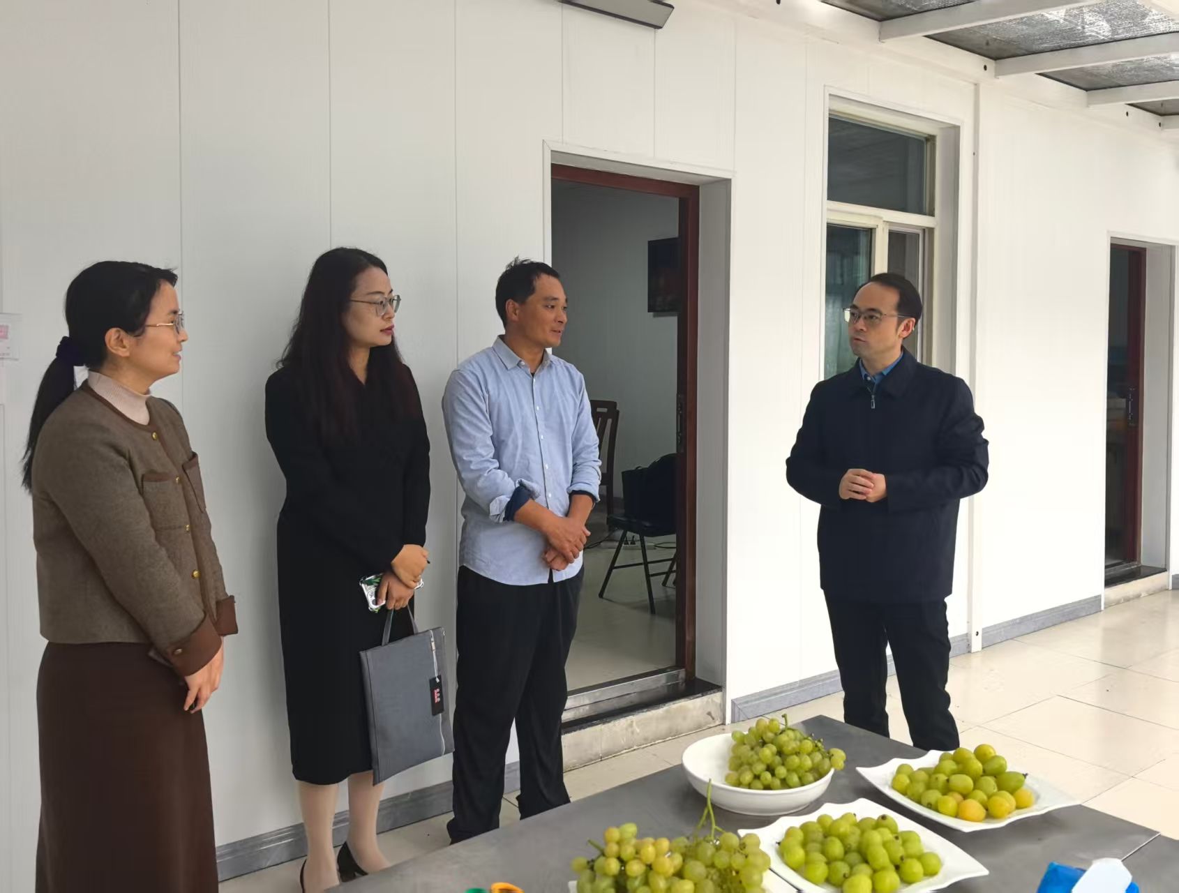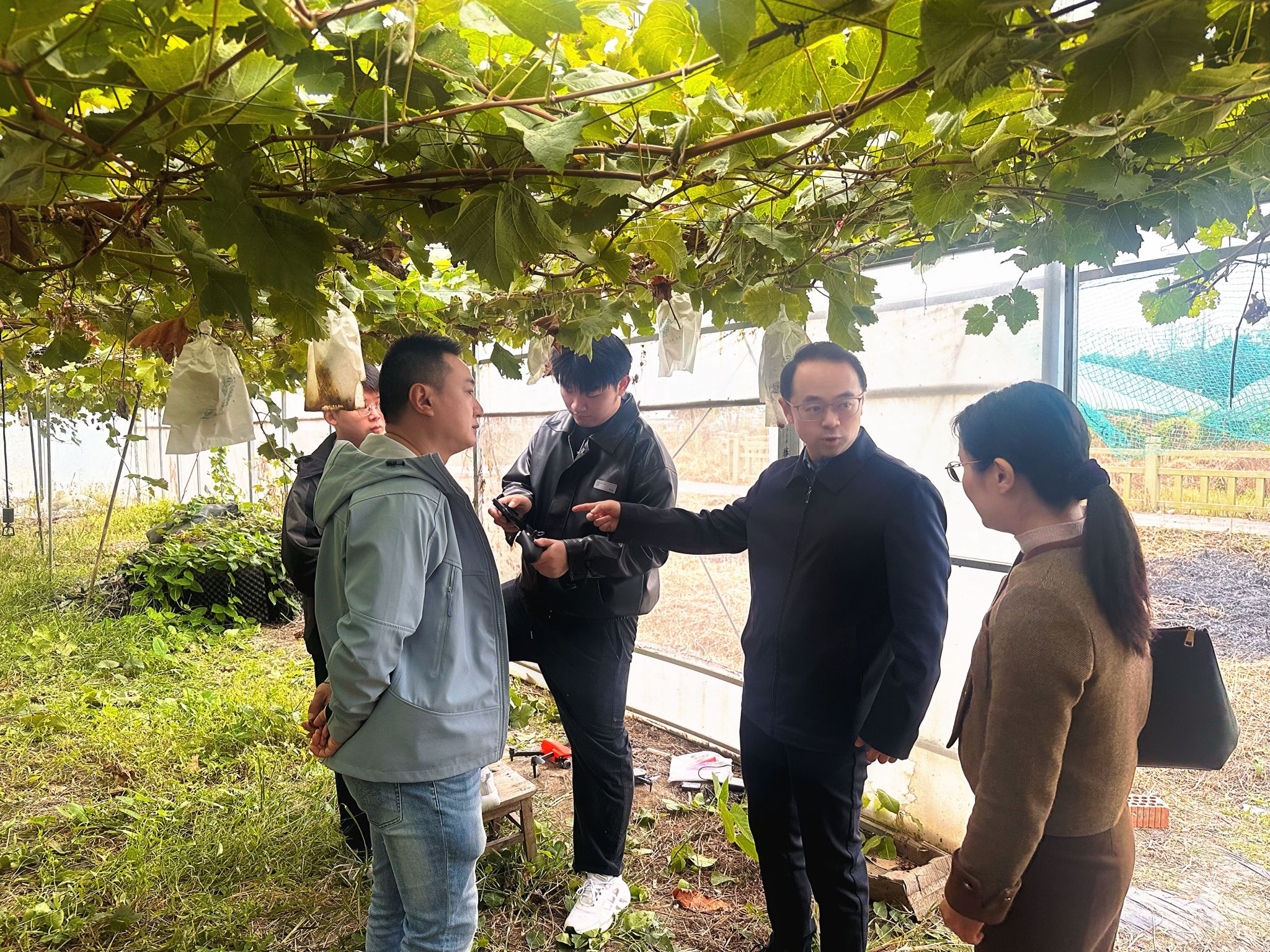 单晓峰一行现场观摩了sjb世俱杯智慧农业团队无人机大棚内采集数据的场景。学校企业班主任、南京太田葡萄科技有限公司总经理韩做善和南京聚变航天信息科技有限公司副总经理马培利分别就智慧葡萄种植技术及无人机低空应用方面的产业需求作了详细介绍。