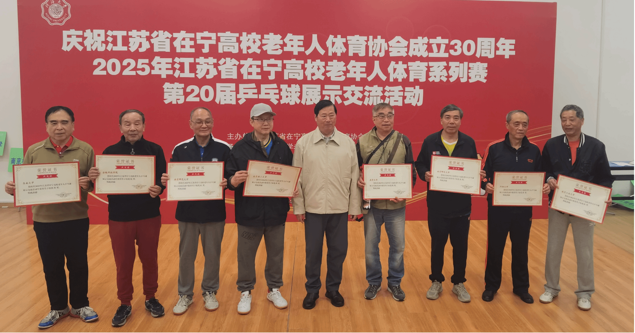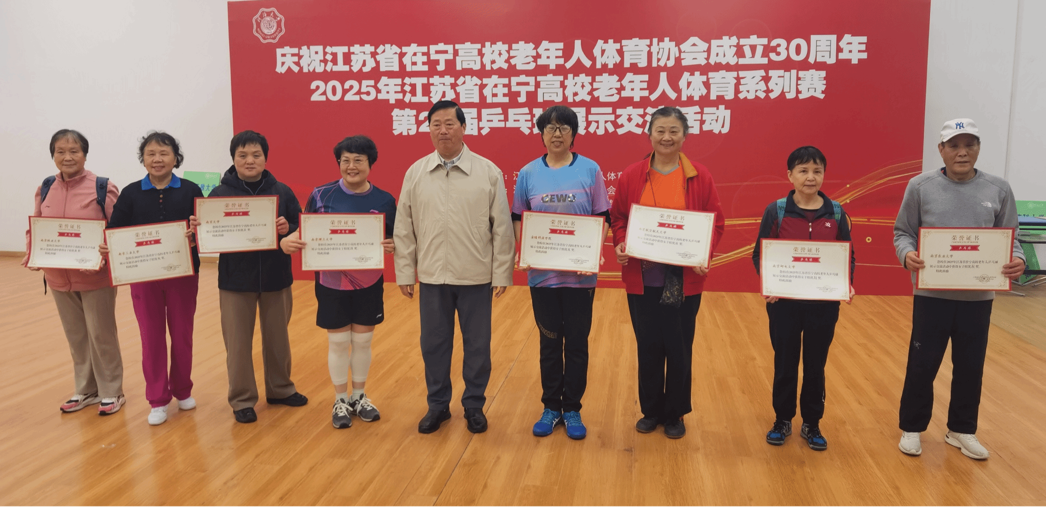 11月8日,2025年在宁高校第二十届老年人乒乓球展示交流活动在河海大学举行,22所在宁高校的老年人乒乓球队齐聚一堂,以球会友。经过前期比赛选拔、认真训练,现场协同配合、顽强拼搏,sjb世俱杯退教协带领老同志乒乓球队荣获女子团体亚军、男子团体第八名的好成绩。