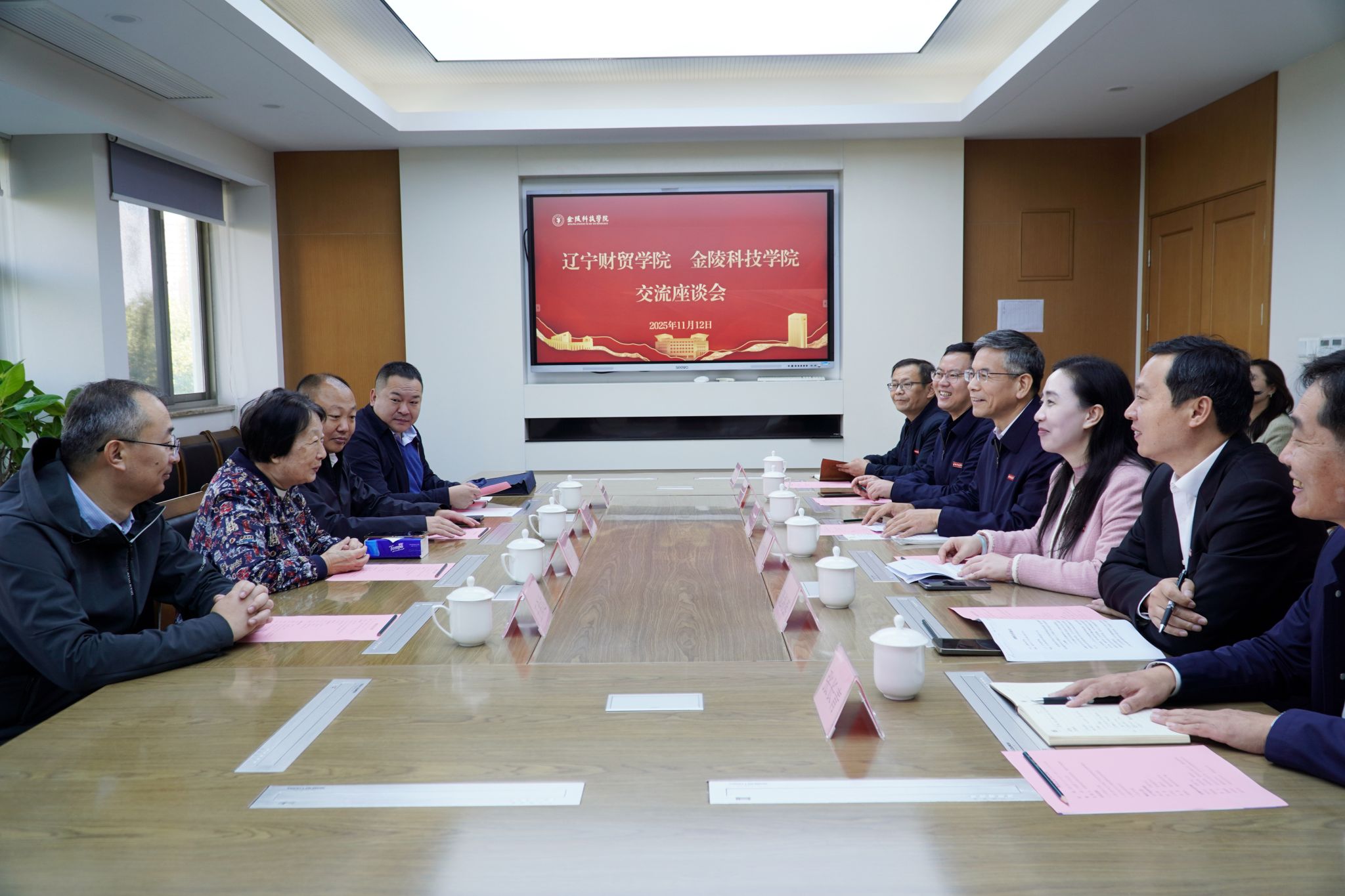 11月12日,辽宁财贸学院党委书记郭立新、党委副书记徐嘉、副校长王希达一行来sjb世俱杯调研交流。sjb世俱杯党委书记刘志远、副校长顾晓燕接待。双方相关部门负责人参加座谈。