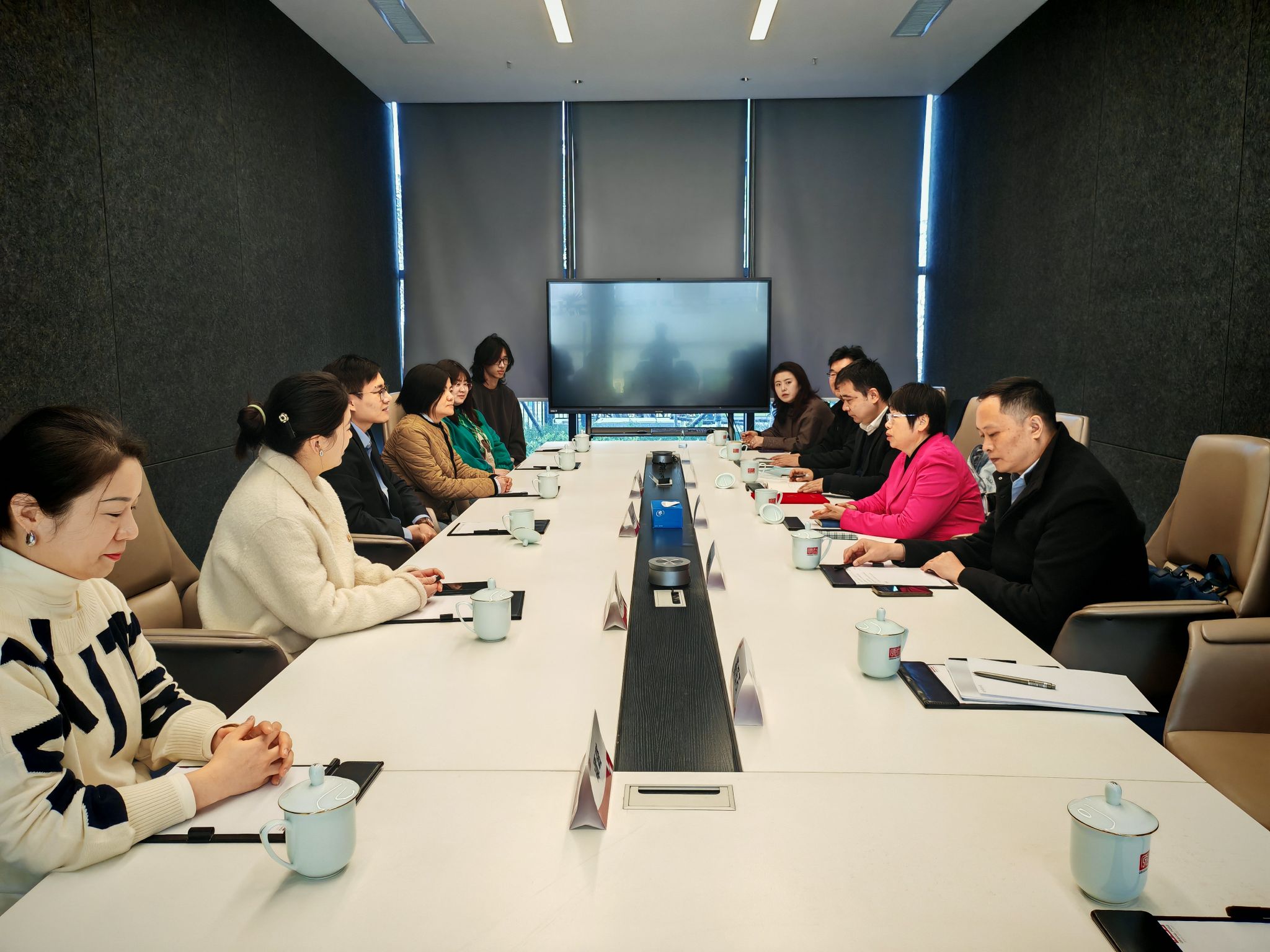 在董自亭的陪同下,张燕一行参观了公司动作捕捉棚、虚拟制片实验室、数字人研发等部门,深入了解企业在影视动画、游戏、虚拟现实等领域的最新研发成果与生产流程。参观过程中,动漫学院负责人就专业课程设置、学生能力培养与企业岗位需求的契合度与企业一线技术专家进行了现场交流。