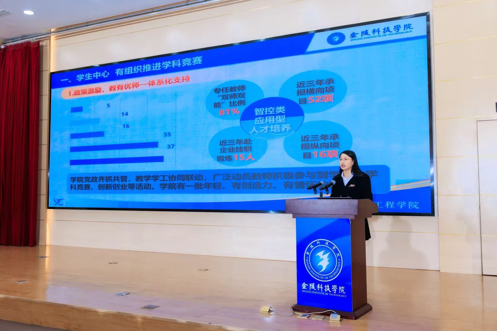 顾晓燕结合了2025年参与国创赛的经验,对《2026年度高水平学生科技创新竞赛项目遴选与培育计划》进行了系统安排,并解读了“分层培育、逐级提升”全流程培育体系:一是校内培育阶段,入库项目获“校内学科带头人+企业专家”双导师指导、实验室开放等资源支持;二是校赛组织阶段,对标省赛规则举办校级赛事,邀请校外专家筛选省赛种子项目;三是省赛备赛阶段,通过二次答辩、精准辅导、对标交流等提升项目落地性与竞争力;四是国赛冲刺阶段,邀请国赛评委辅导与模拟答辩,推动成果转化。