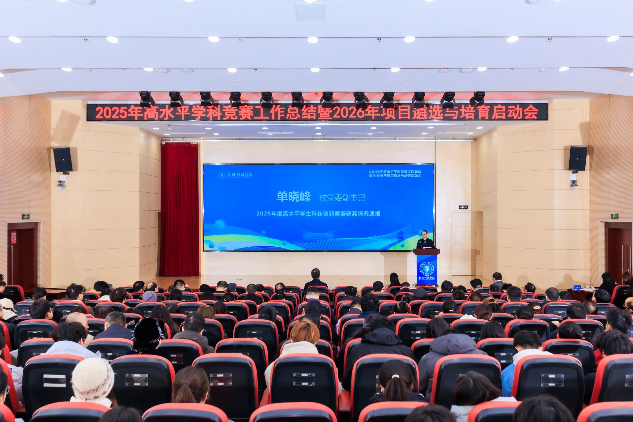 单晓峰通报了2025年度高水平学生科技创新竞赛获奖情况,并特别指出学校在三大赛事中表现突出:在中国国际大学生创新大赛中荣获国家级银奖1项、铜奖1项,以及省级奖项10项;在第十九届“挑战杯”竞赛中斩获国家级三等奖2项,省级奖项6项;在世界技能大赛人工智能赛道中摘得国家级铜奖1项。这些成绩充分展现了师生在创新实践方面的卓越能力。