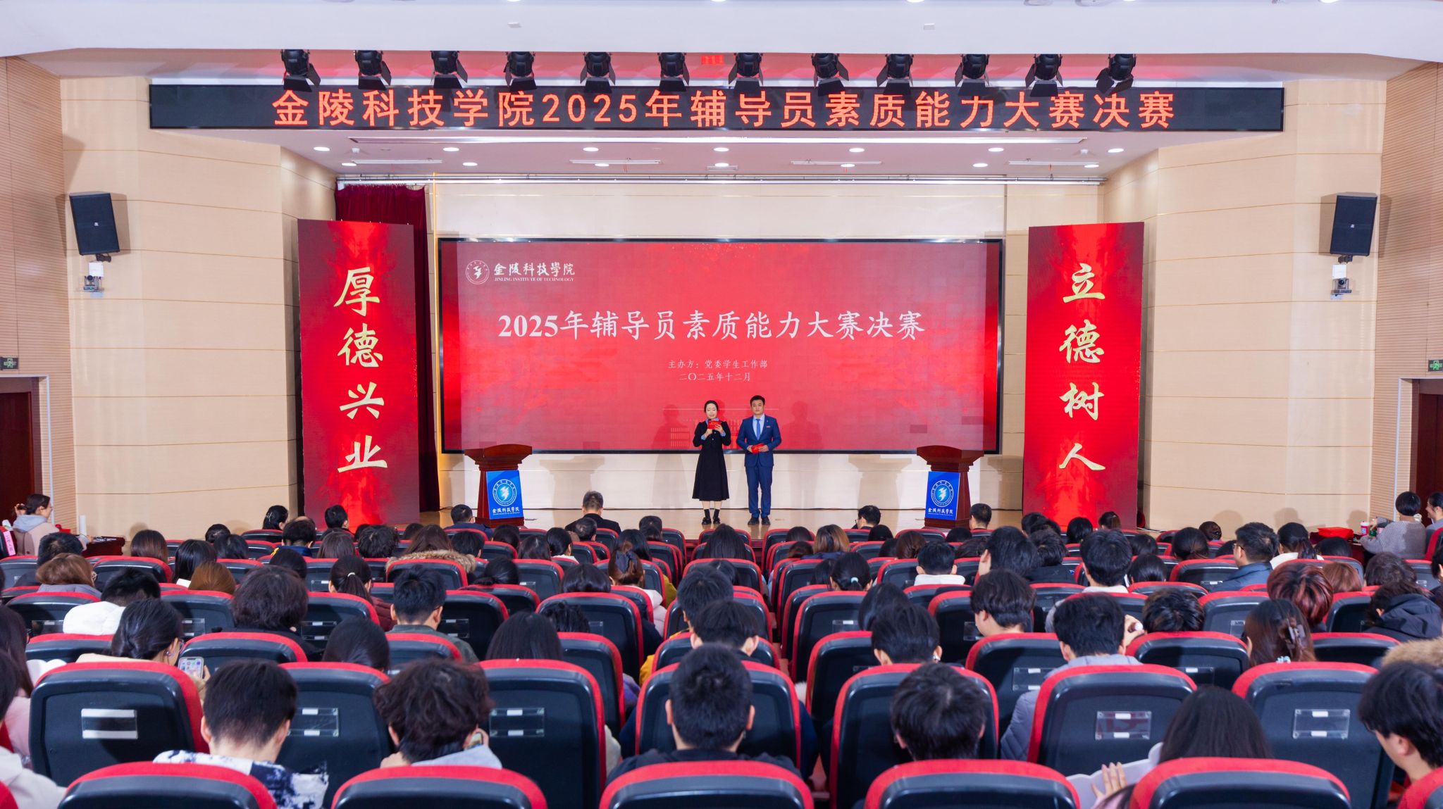 12月17日下午,sjb世俱杯2025年辅导员素质能力大赛决赛在江宁校区科技楼报告厅举行。校党委副书记单晓峰出席活动,南京晓庄学院党委学生工作部部长吴鑫、三江学院党委学生工作部部长周学军、南京师范大学党委学生工作部副部长汪育文应邀担任大赛评委。学校相关职能部门负责人,各二级学院学生工作书记、副书记,辅导员及学生亲友团到场观摩比赛。
