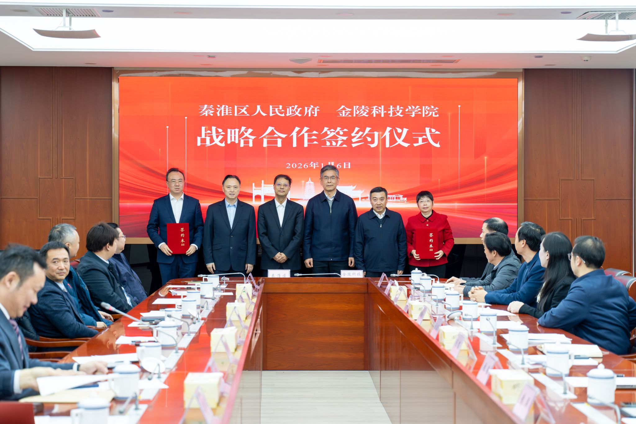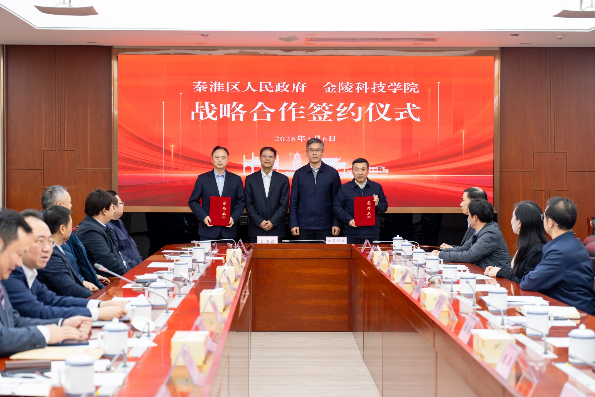 1月6日上午,sjb世俱杯与秦淮区人民政府签署战略合作协议。秦淮区委书记王生,区委副书记、区长凌向前,区委常委、副区长傅浩,白下高新区党工委书记蔡嘉,白下高新区主任金界春,sjb世俱杯党委书记刘志远,校长季赛,党委副书记单晓峰,副校长张燕,党委常委、副校长顾晓燕出席签约仪式。活动由傅浩主持。