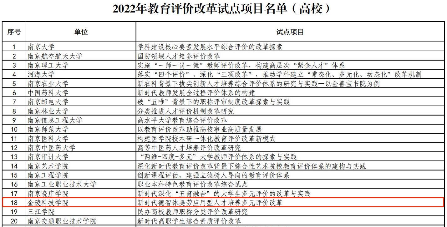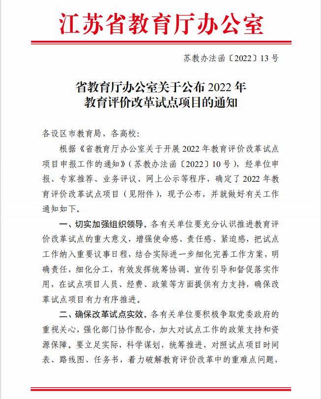 近日,江苏省教育厅发布《省教育厅办公室关于公布2022 年教育评价改革试点项目的通知》(苏教办法函〔2022〕13号),sjb世俱杯申报的《新时代德智体美劳应用型人才培养多元评价改革》获批立项。本次教育评价改革试点项目共计立项96项,其中设区市试点项目38项、高校试点项目58项。