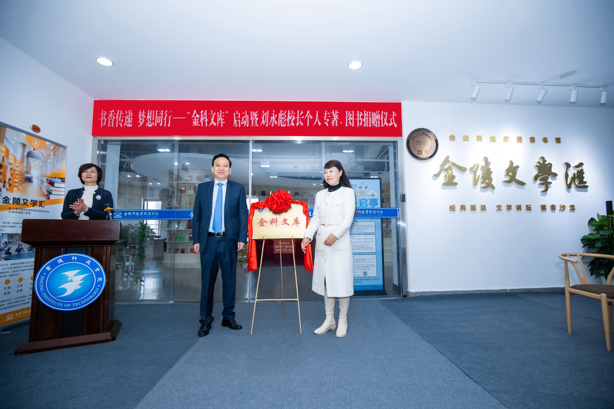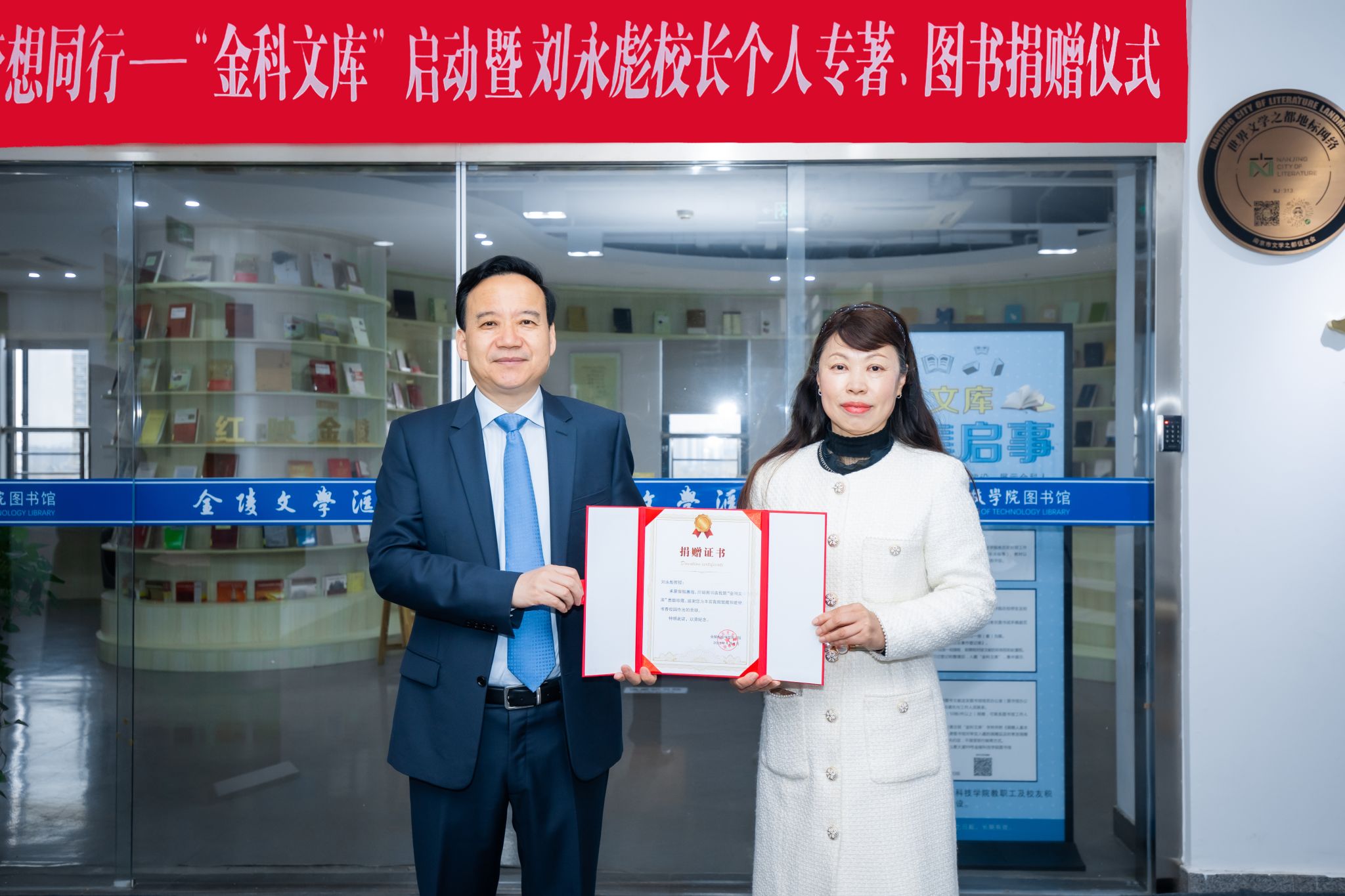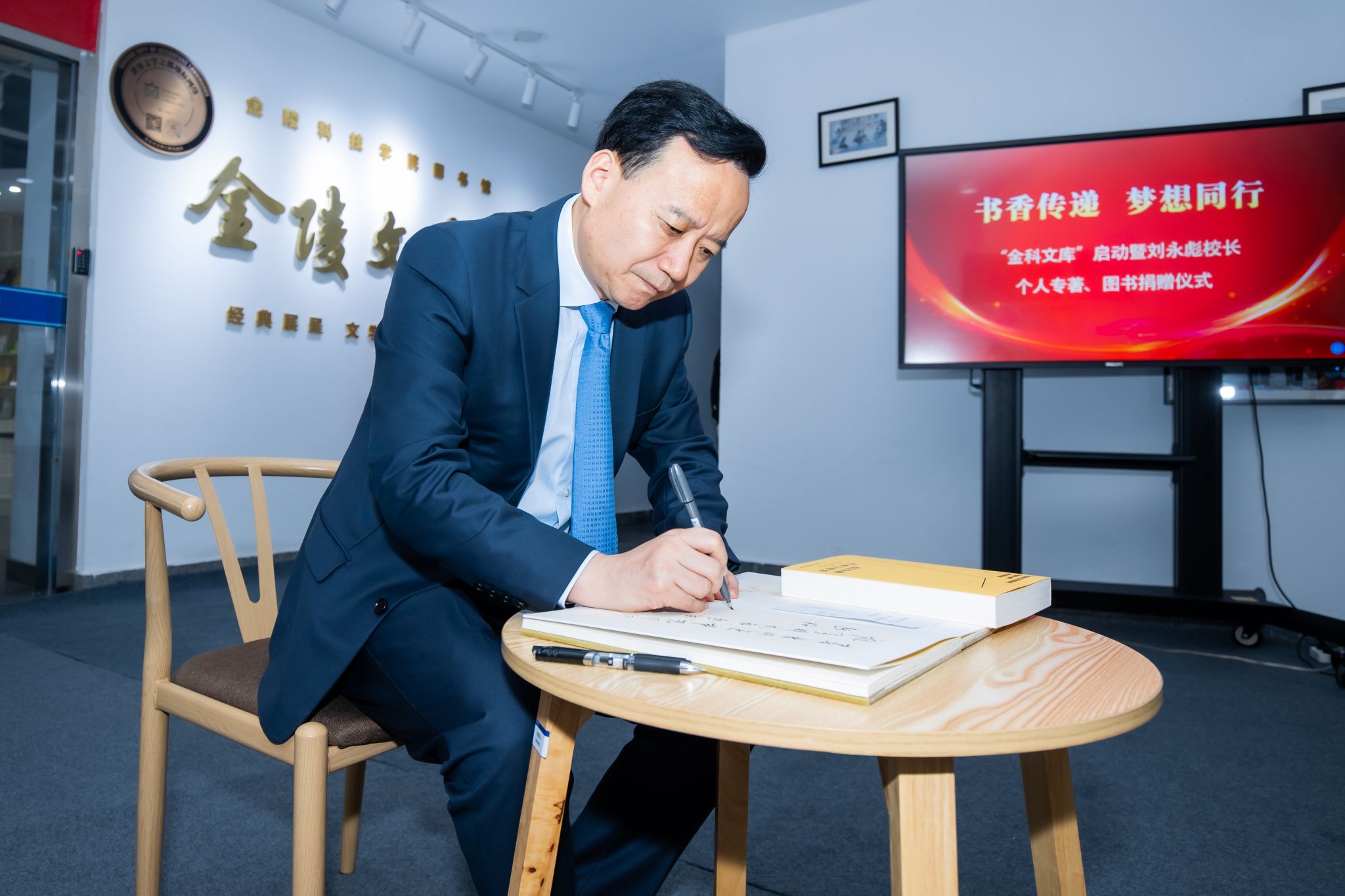 活动仪式上,刘永彪签名赠书。与会领导和师生一起合影留念,并参观了“金陵文学汇”。