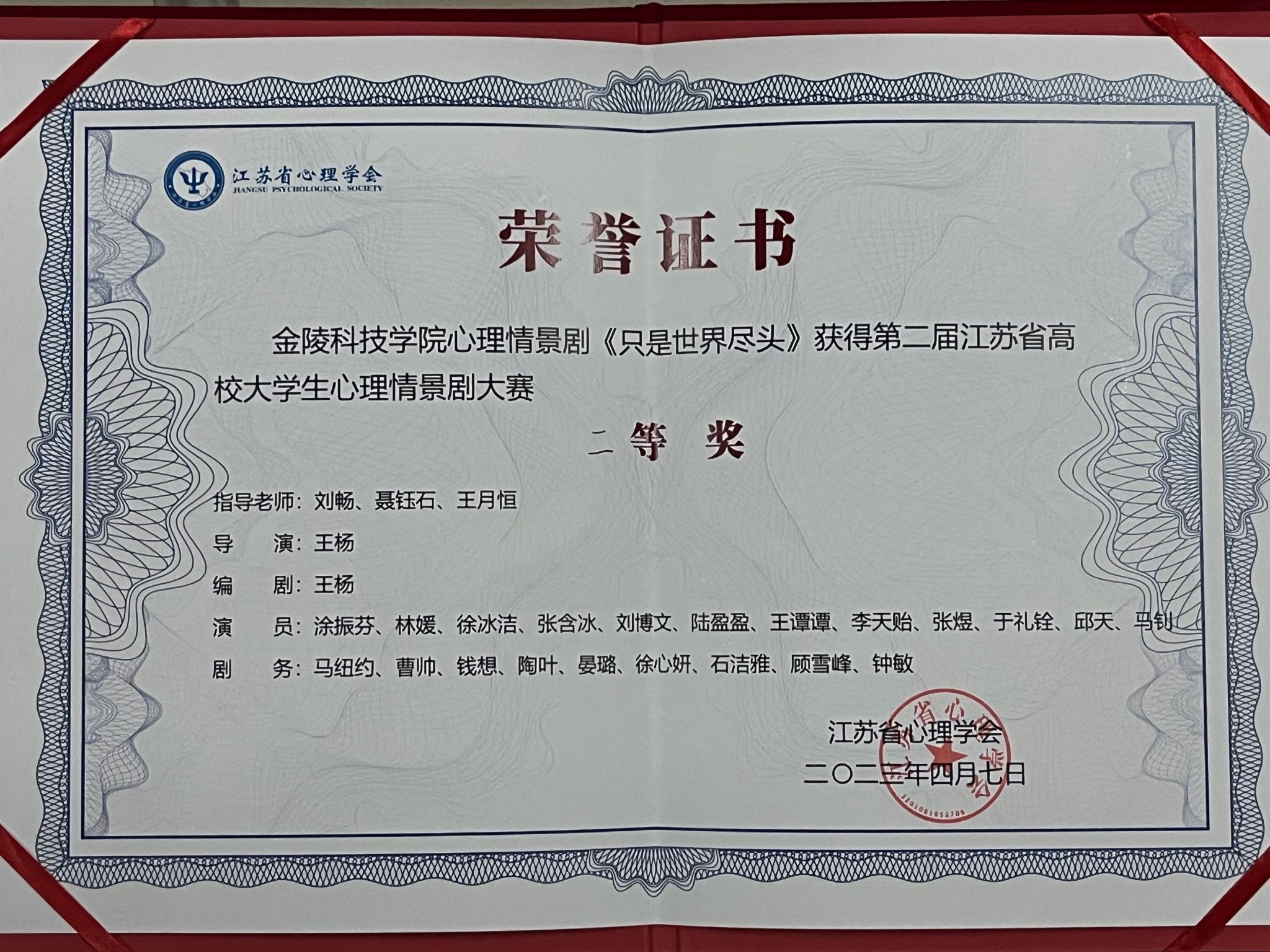 第二届江苏省高校大学生心理情景剧二等奖证书