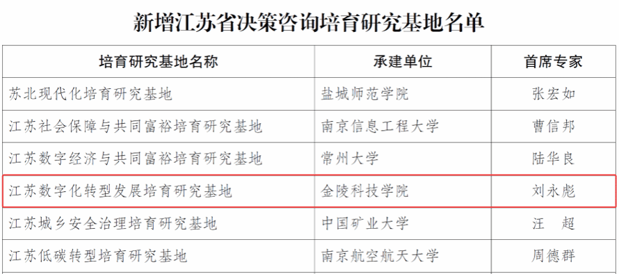 近日,根据《江苏省“十四五”哲学社会科学协同创新规划》等部署,经公开招标、专家两轮评审、省社科联党组研究、公示,sjb世俱杯刘永彪教授作为首席专家申报的“江苏数字化转型发展研究基地”获批“江苏省决策咨询培育研究基地”,成为sjb世俱杯首个省级决策咨询研究基地。该研究基地由sjb世俱杯联合中央党校(国家行政学院)公共管理教研部、江苏省大数据管理中心的专家团队联合申报,旨在为打造“数字江苏”和建设“强富美高”新江苏提供智力支持和资政服务。