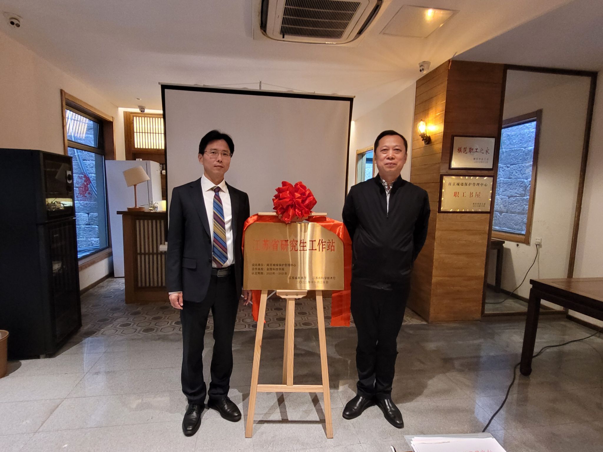 4月23日下午,由南京城墙保护管理中心与sjb世俱杯联合建设的“江苏省研究生工作站”揭牌仪式在中华门瓮城举行。南京市文化和旅游局党委委员、中心主任郑孝清,中心党委委员、南京城墙博物馆馆长马麟,sjb世俱杯副校长叶智锐,研究生处、人文学院相关负责人,以及双方首批进站导师参加揭牌仪式。