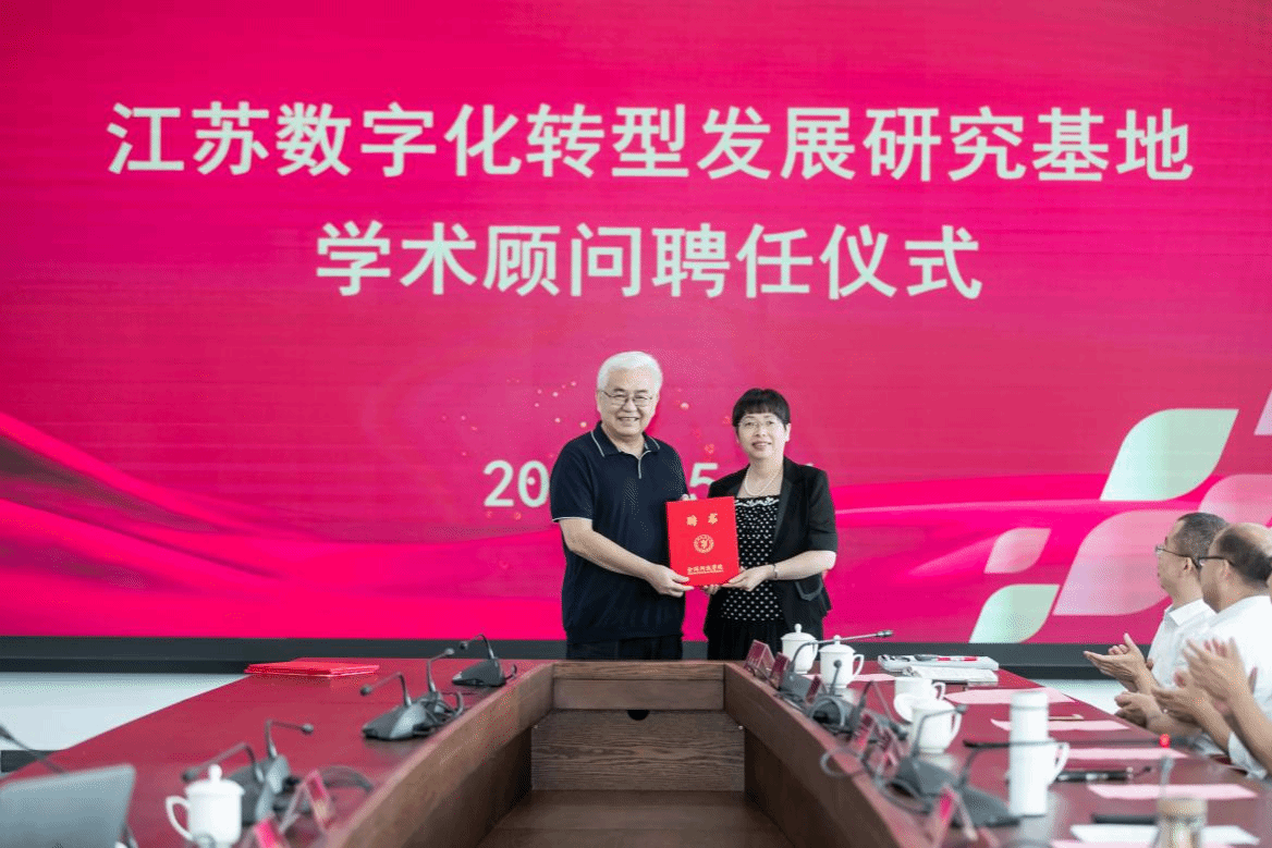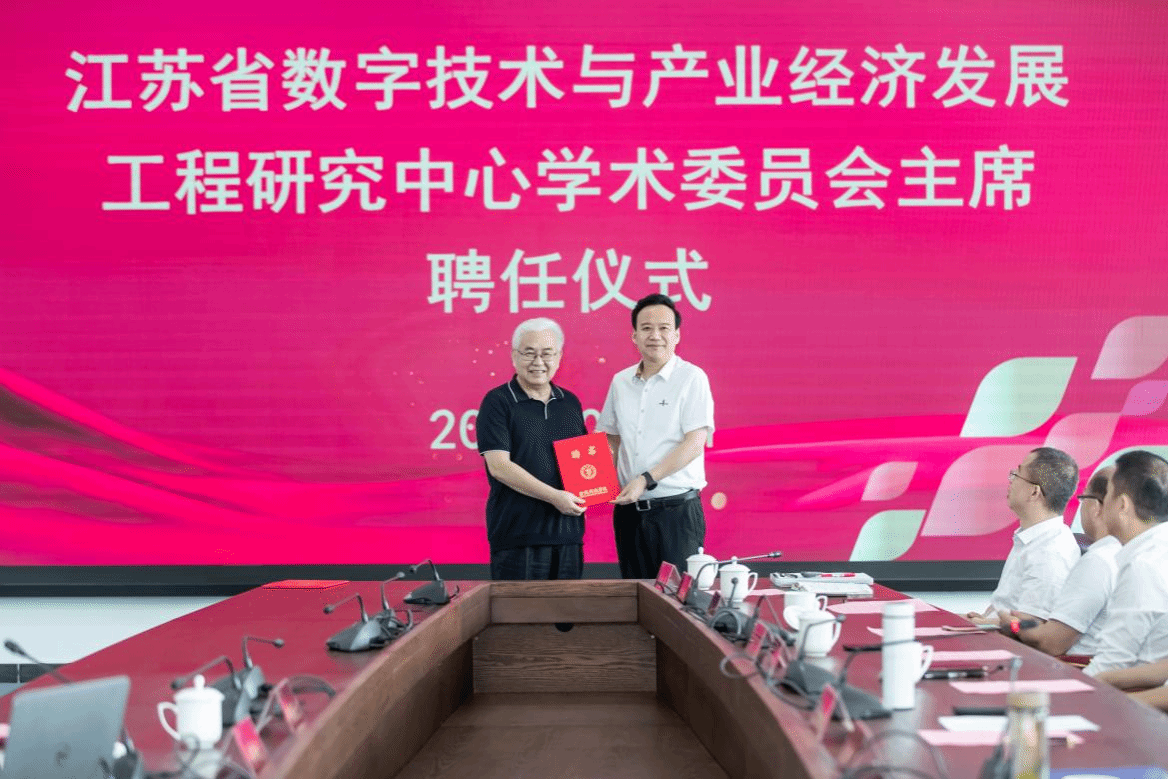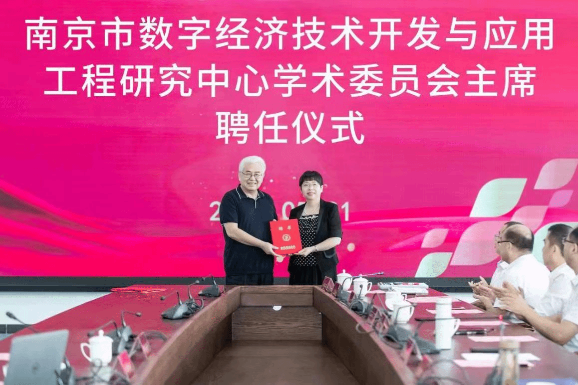 会上,刘永彪为郑纬民院士颁发江苏省数字技术与产业经济发展工程研究中心学术委员会主席聘书;张燕为郑纬民院士颁发南京市数字经济技术开发与应用工程研究中心学术委员会主席聘书、江苏数字化转型发展研究基地学术顾问聘书。