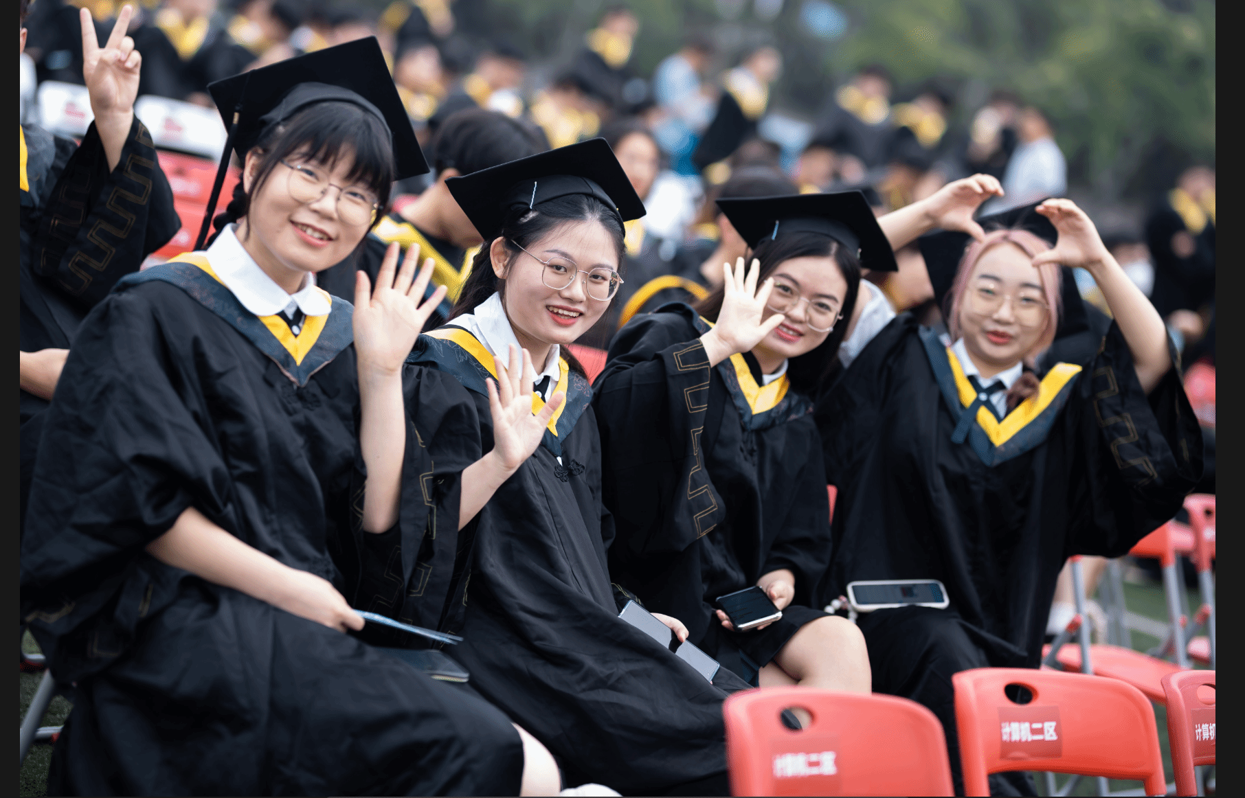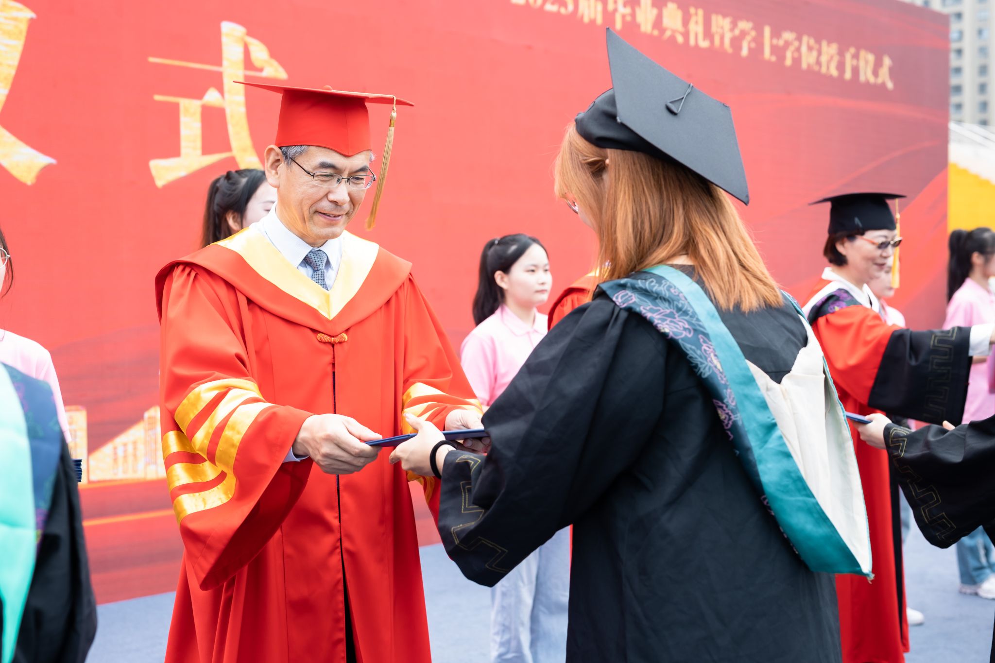 在悠扬的乐曲声中,校领导为现场的毕业生依次拨穗正冠、颁发学位证书并合影留念,定格美好瞬间。