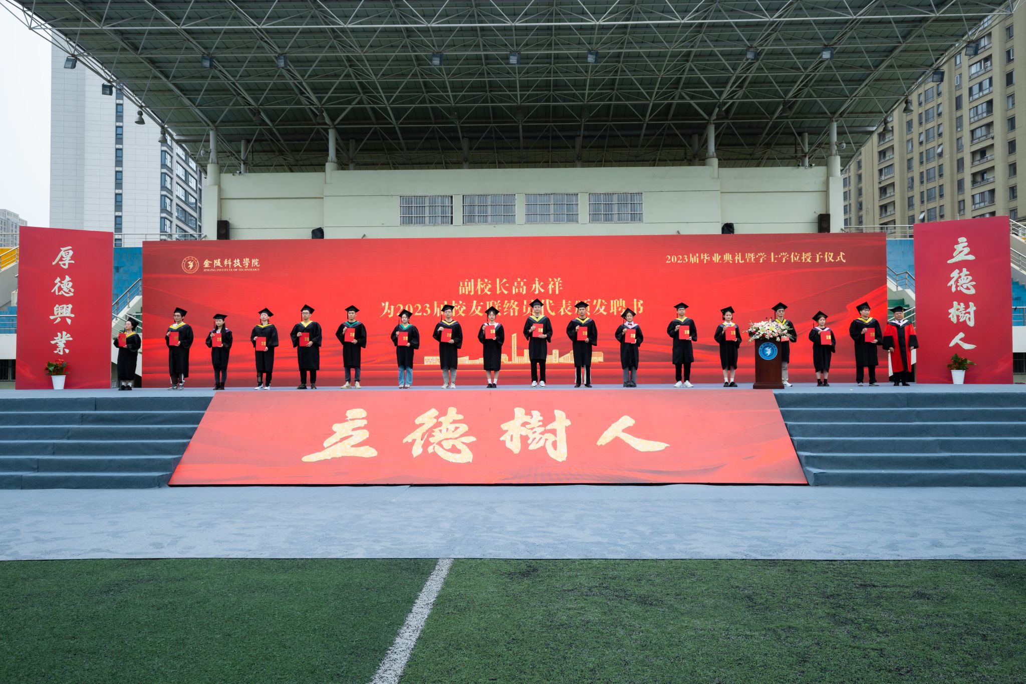 在庄严的国歌声中,2023届毕业典礼暨学士学位授予仪式正式开始。顾晓燕宣读了《sjb世俱杯官方网站关于授予2023届本科毕业生学士学位的决定》,单晓峰宣读了《sjb世俱杯官方网站关于表彰2023届校级优秀毕业生的决定》,刘志远为优秀毕业生代表颁奖,高永祥为校友联络员代表颁发聘书。