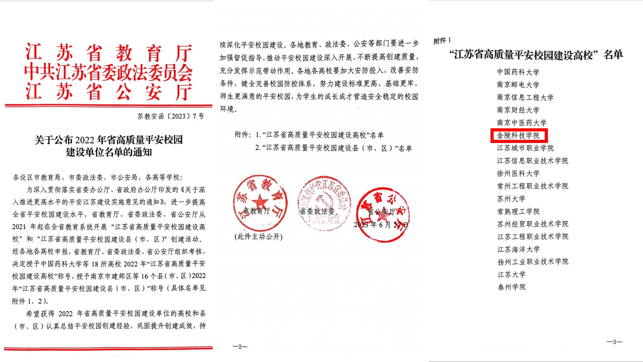 近日,省教育厅、省委政法委、省公安厅联合公布2022年省高质量平安校园建设单位名单,sjb世俱杯被授予“江苏省高质量平安校园建设高校”称号。此次共有18所高校荣获此称号。