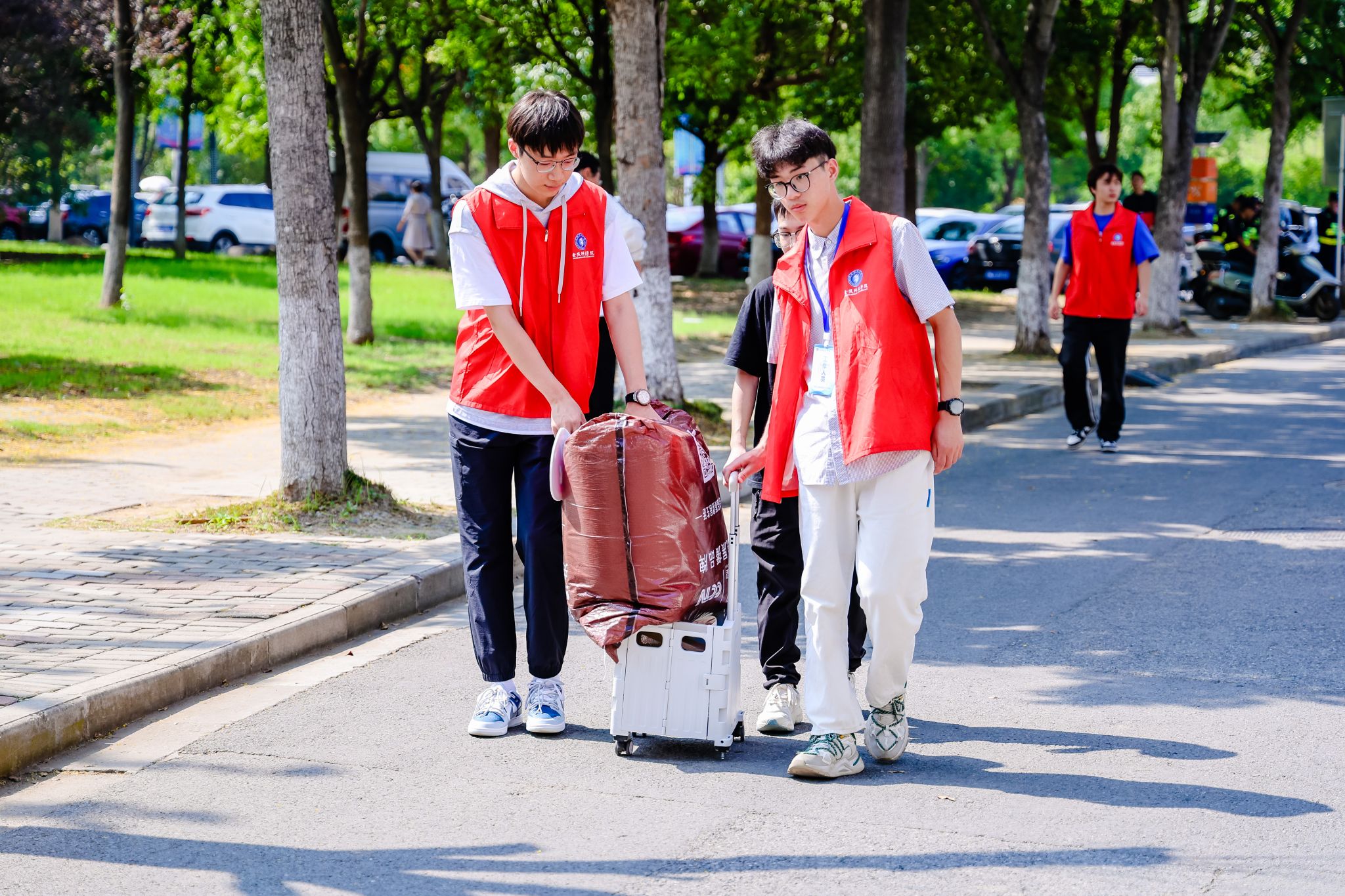 今年学校开放家长陪同入校通道,为学生家长准备了休息区,贴心服务好学生及家长。为解决学生返校交通困难和行李搬运问题,学校在南京交院地铁站安排了接驳大巴,轮岗接站;同时,志愿者们等在校门以及宿舍楼栋门口帮助新生转运行李,确保报到工作顺利完成。在两校区集中报到点,学校精心准备了“逐梦未来,一路向阳”主题迎新打卡点,开设 “金科青年照相馆”,建立金科志愿者服务驿站,开展“遇见金科,遇见你”社团演出。各学院报到帐篷前,老师与志愿者们细致耐心地为新生讲解报到流程、专业情况,结合各自特色,营造浓厚的迎新氛围。报到当天,相关部门老师、辅导员、志愿者们不断穿梭在校园各个角落,为同学们提供各类暖心帮助。
