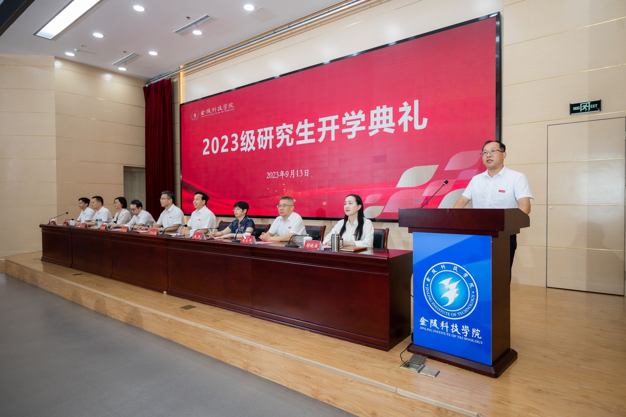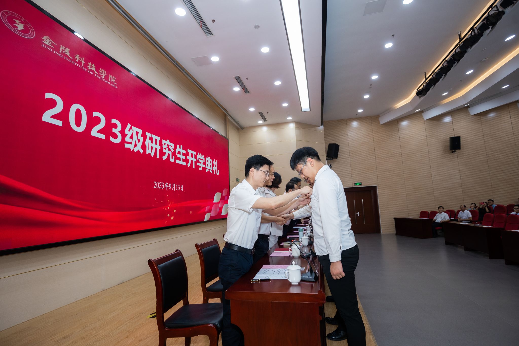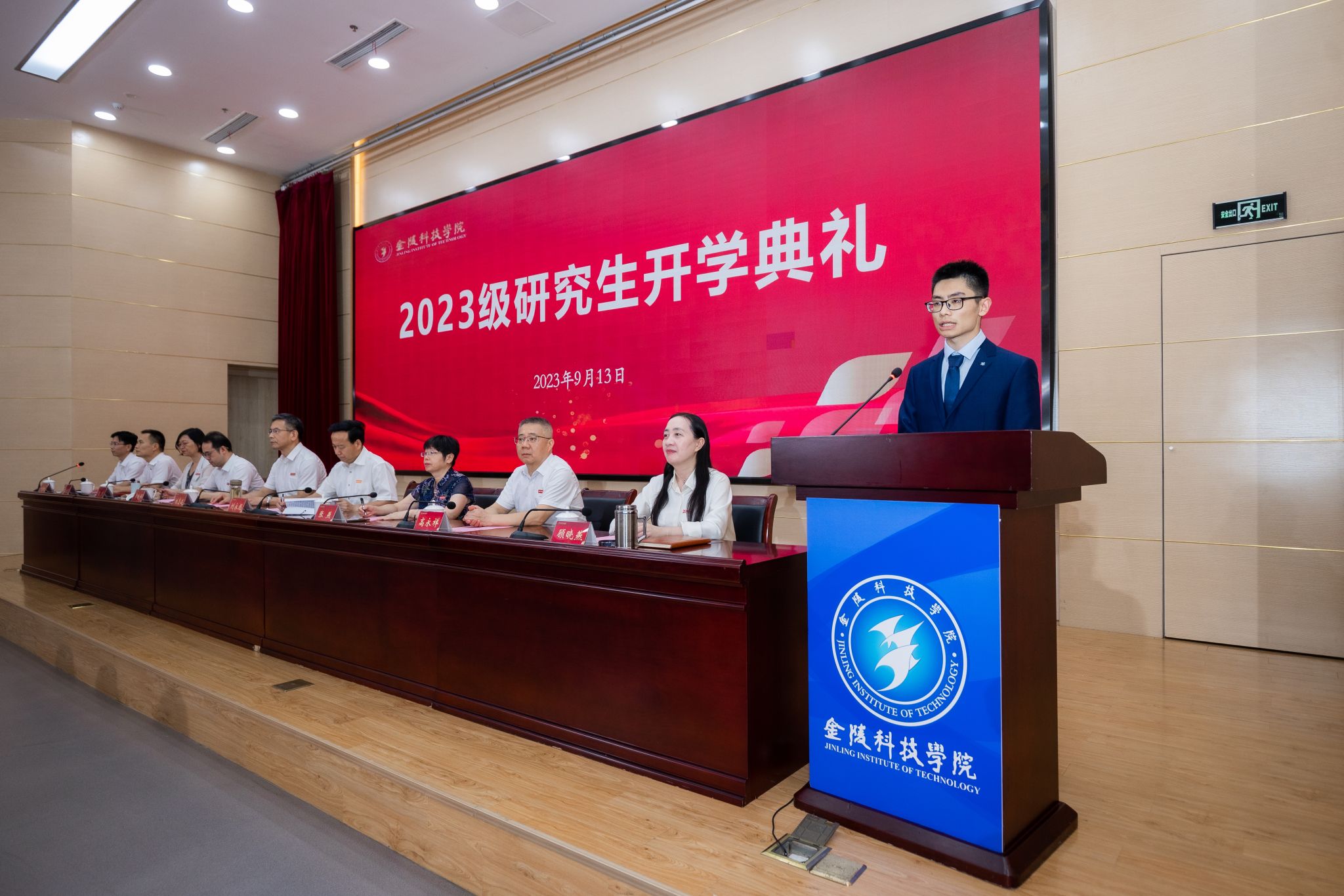 开学典礼上,全体校领导为新生代表佩戴了校徽。软件工程学院院长曾岳教授作为研究生导师代表发言,他从导师的角度向新生提出建议,并预祝每位同学在研究生学习生涯中取得优异成绩和丰硕的学术成果,顺利完成学业。会计专硕点胡科伟作为新生代表发言,他表示,作为首届研究生应当与学校共同成长,以自己最大的热情去追逐梦想。