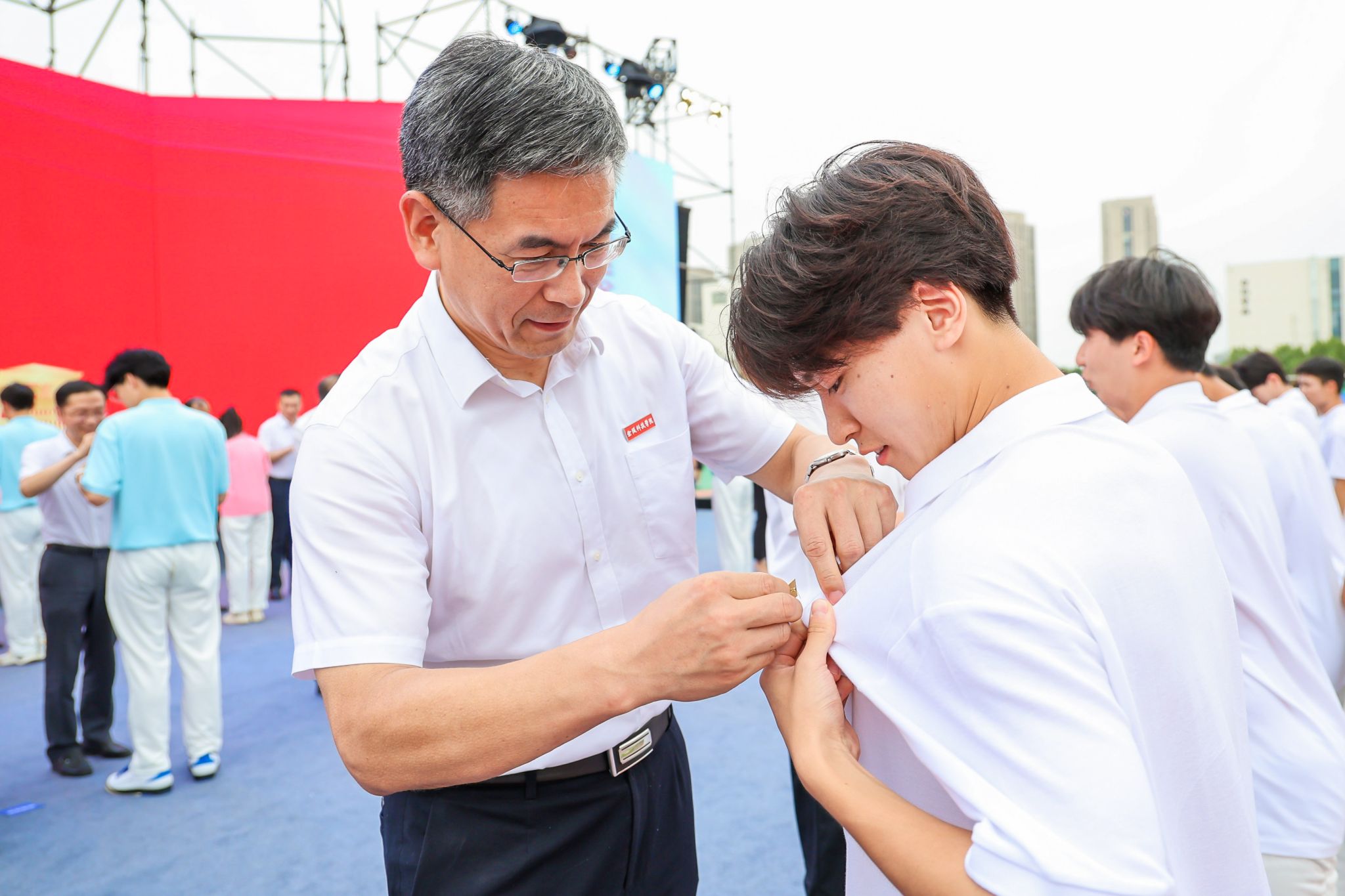 校党委书记刘志远为新生佩戴校徽