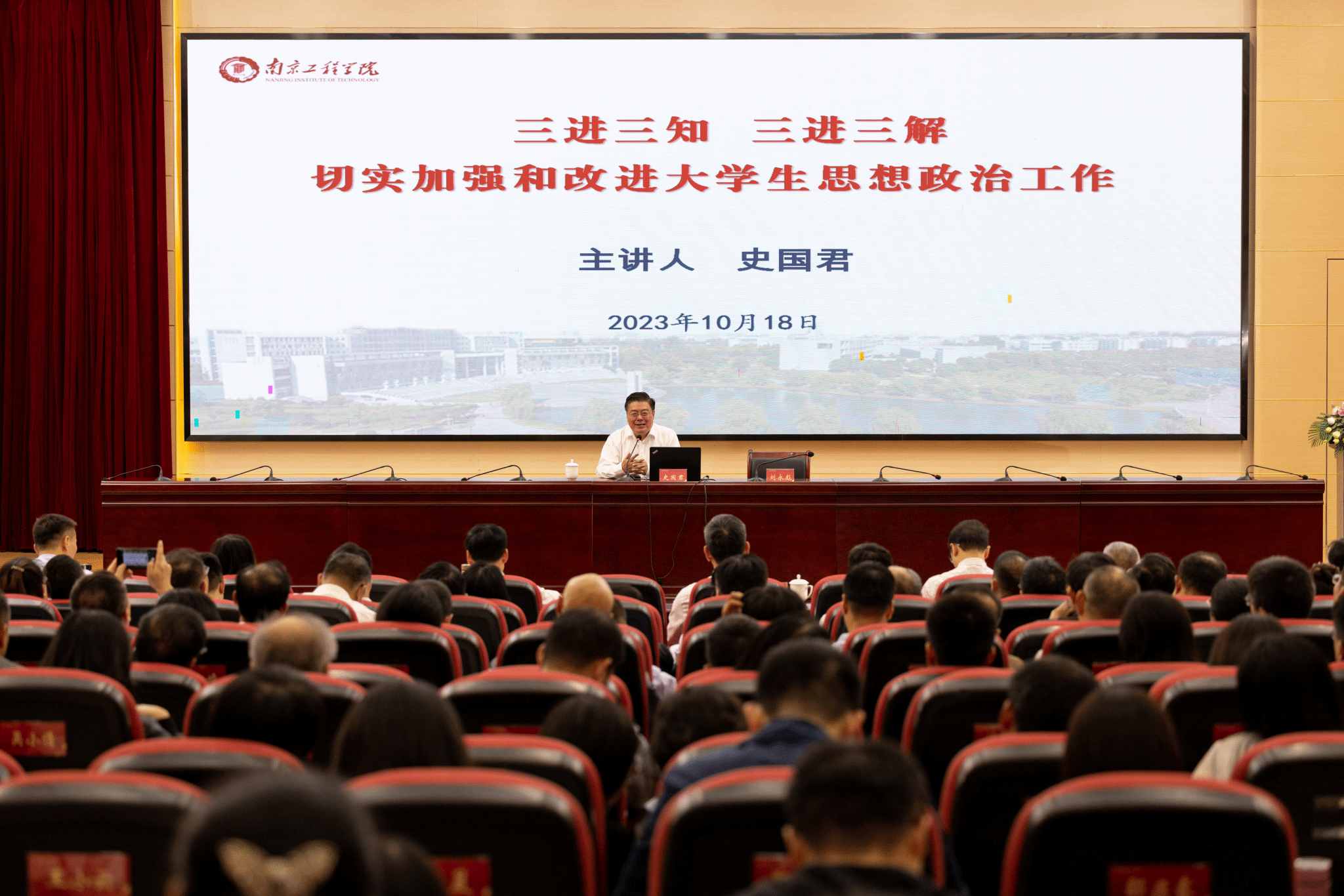 会议邀请省人大十四届常委、省法制委副主任委员、南京工程学院原党委书记史国君教授作思想政治工作专题辅导报告。他以《三进三知 三进三解 切实加强和改进大学生思想政治工作》为题,深入阐释加强和改进大学生思想政治教育的重要意义,举例讲述南京工程学院作出的生动实践,并倾心分享了自己的工作思考。他认为,要认真学习习近平总书记重要讲话精神和党的二十大精神,树立精准思政的思维理念,找准思政工作的育人切口,拓展思政工作的场域空间,贴近时代、贴近实际、贴近学生真实生活,不断提高思想政治工作质效。