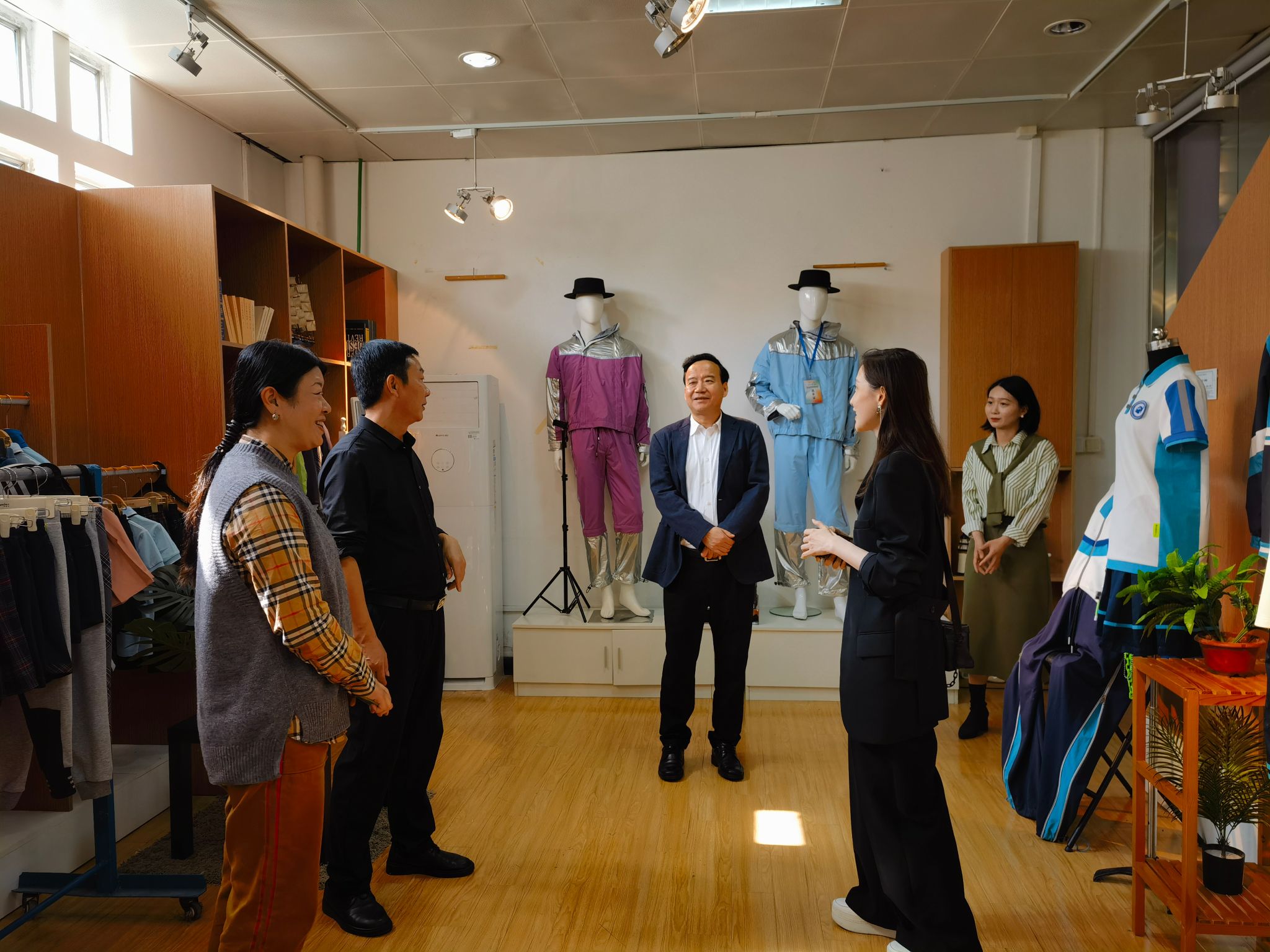 谈伊妮参观了艺术学院的江苏省劳模创新工作室、科学与艺术创意中心和服装设计系实验室。在座谈交流中,她对艺术学院的教学资源、实验室建设、人才培养和学生学科竞赛成果给予高度评价,并与学校在产学研平台建设、毕业生实习就业等方面达成合作意向。