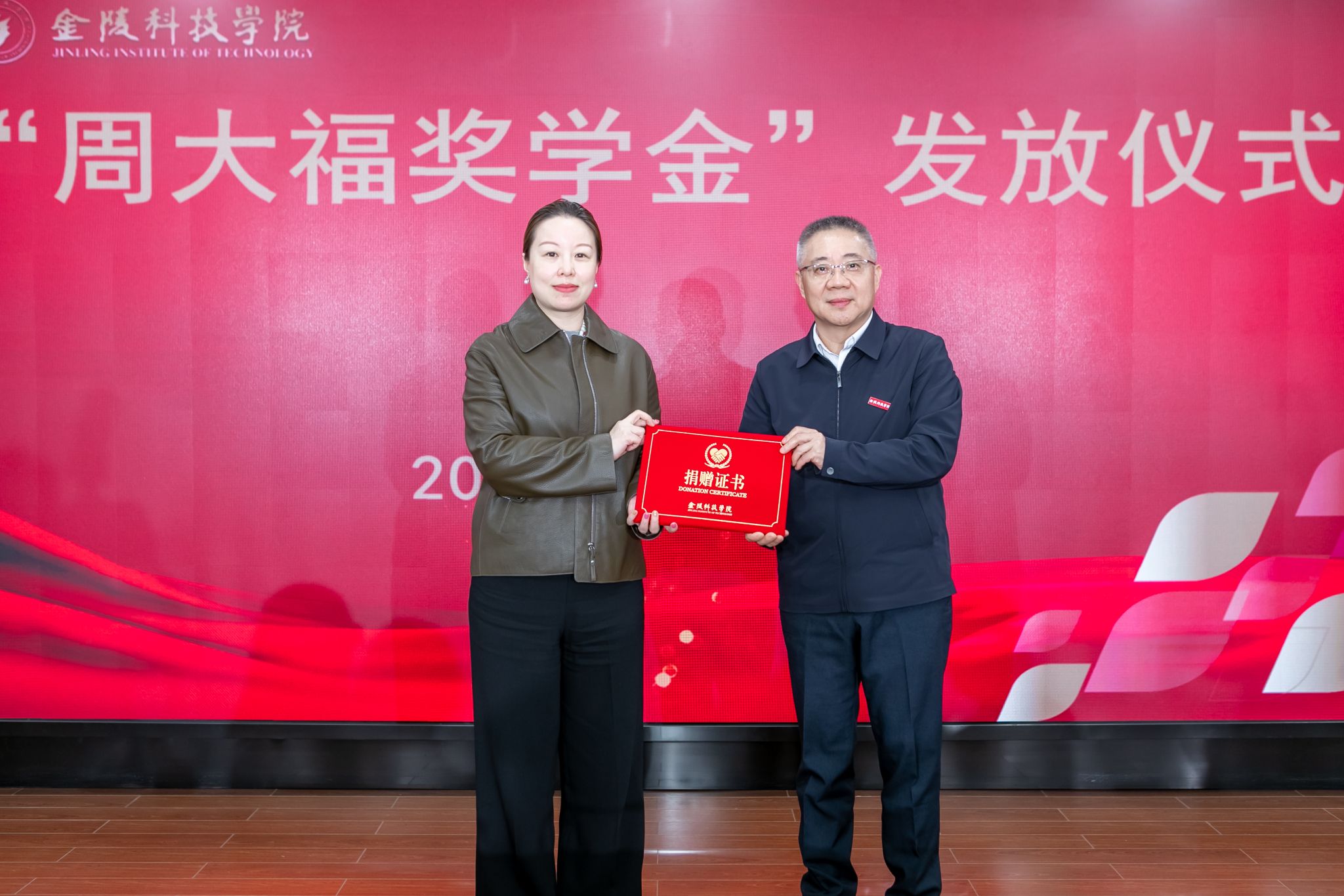 2020级宝石及材料工艺学专业张轩同学作为“周大福奖学金”获奖者代表发言。孙媛、吴钰桦给获奖学生颁发了奖学金。高永祥代表学校接受了周大福珠宝金行(苏州)有限公司的捐款,孙媛代表公司接受了学校颁发的捐赠证书。