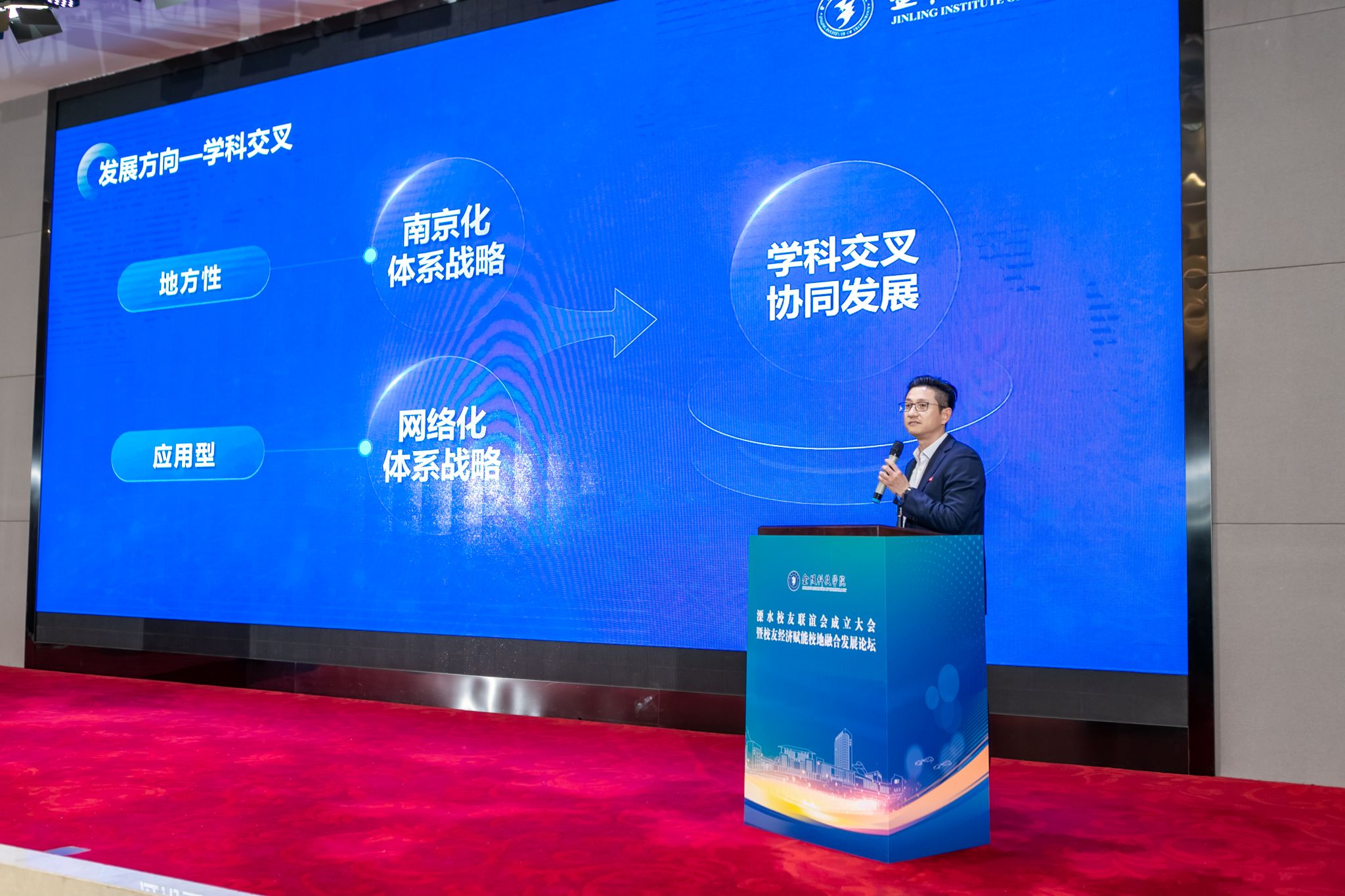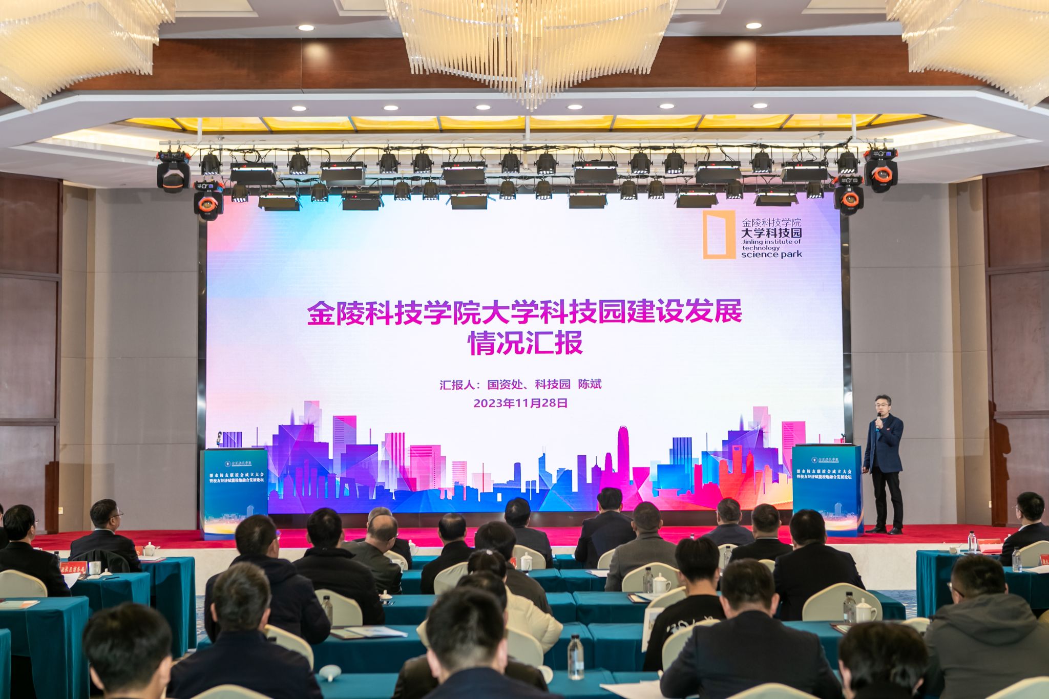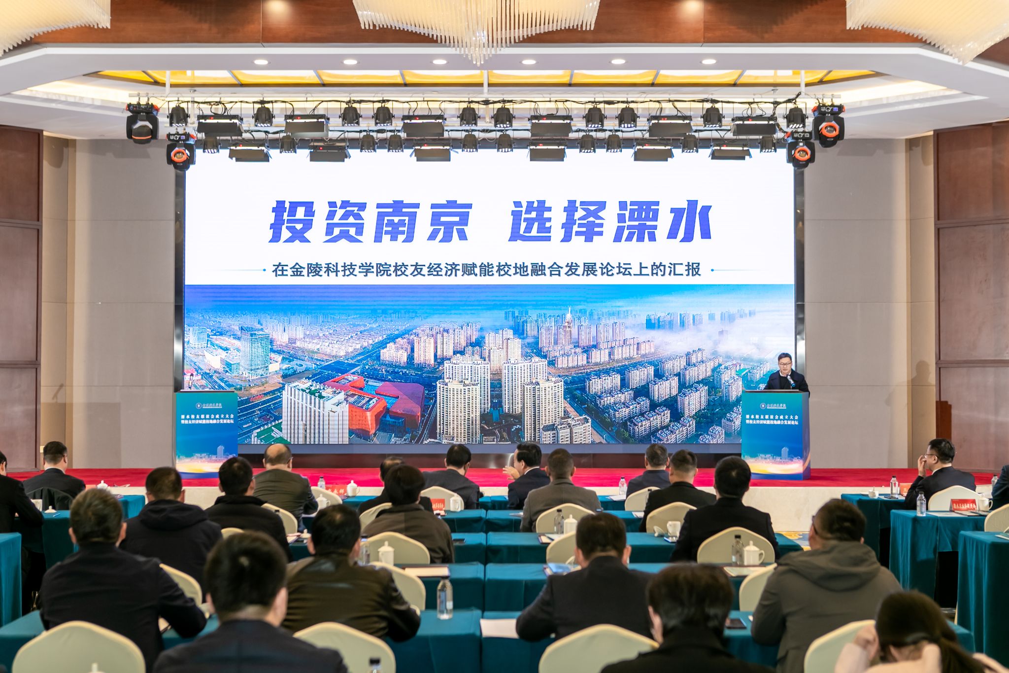 校友经济赋能校地融合发展论坛活动中,与会人员观看了溧水区宣传片,溧水区投资促进局和经济开发区相关负责人介绍了溧水区招商引资情况,sjb世俱杯科技处处长刘磊、科技园管理办公室主任陈斌和招生就业处处长闵光琛分别就学校科技创新情况、大学科技园运营情况和招生就业创业情况进行了介绍。