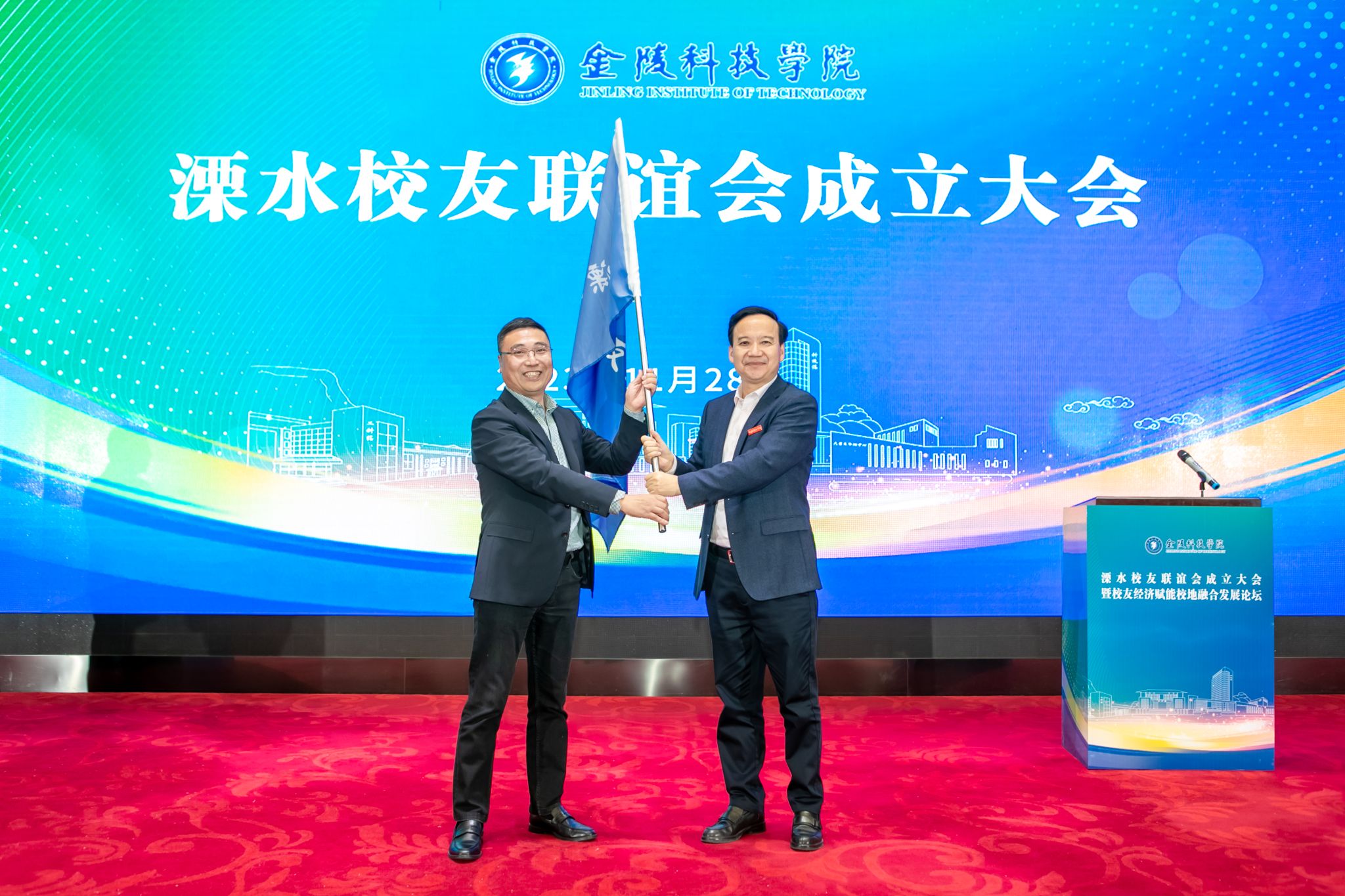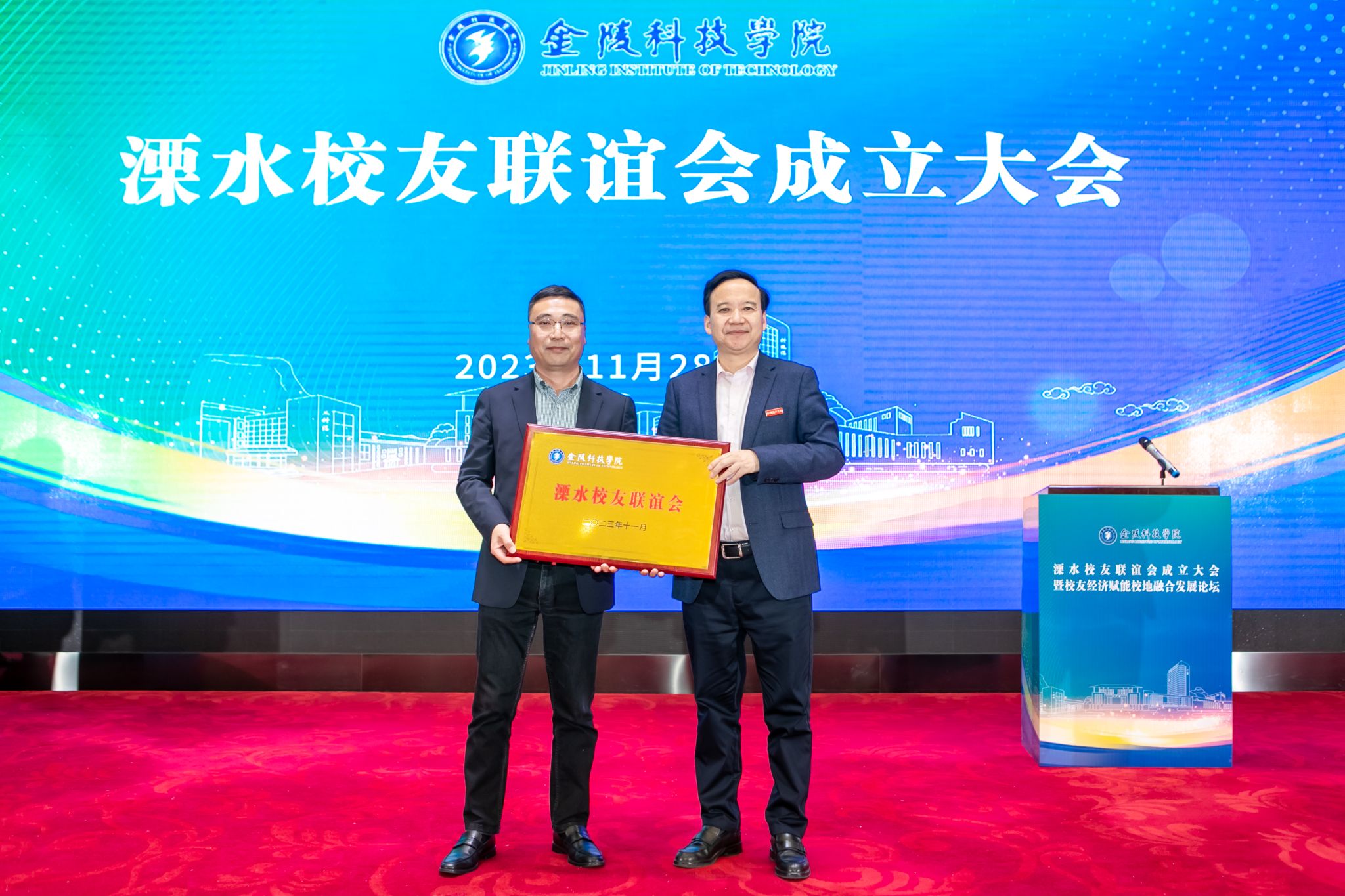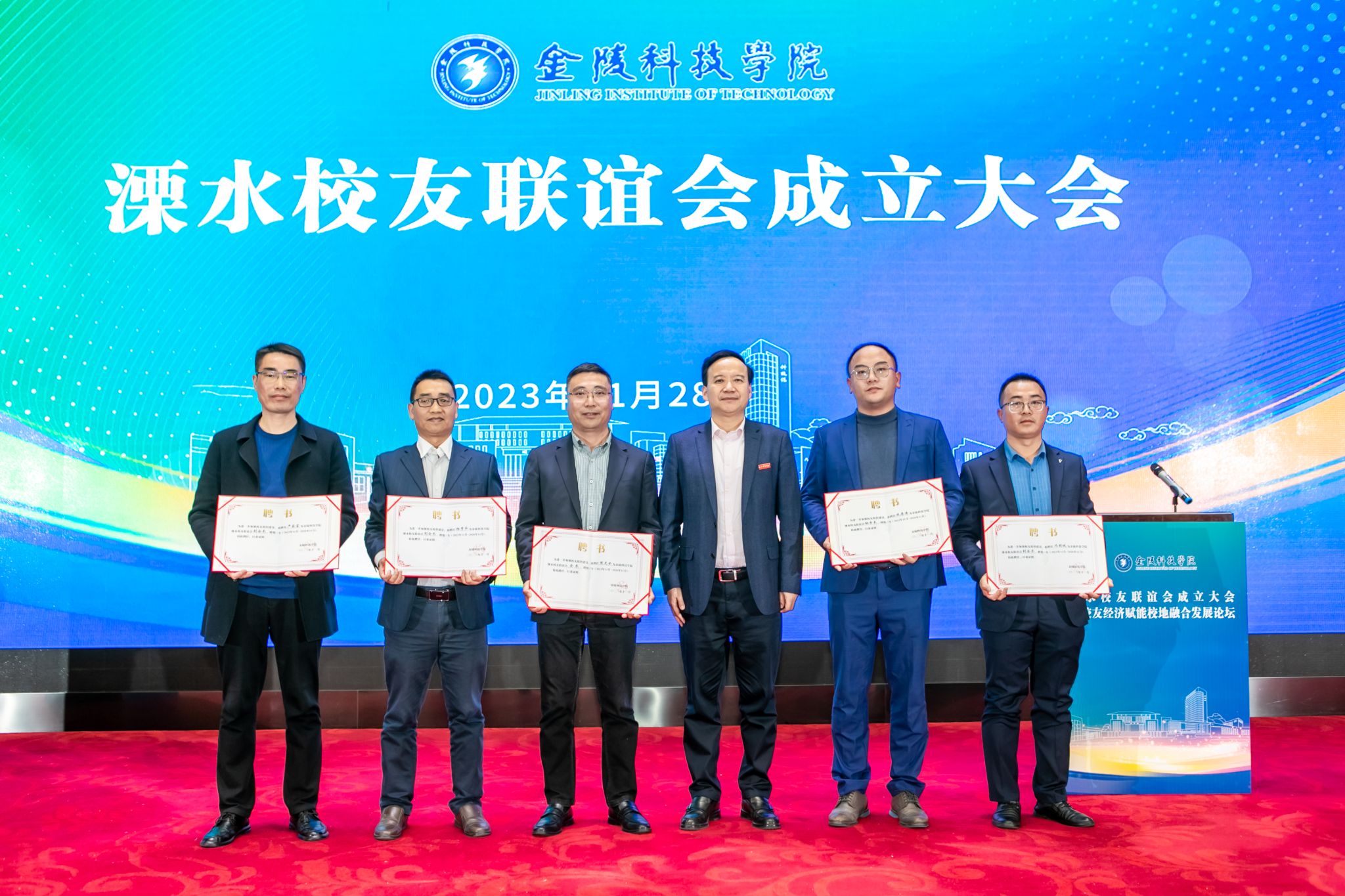 校友联谊会成立大会上,与会人员观看了学校宣传片、听取了校友联谊会准备工作情况汇报,审议通过了会长、副会长、秘书长人员,刘永彪为溧水校友联谊会会长陈龙云,副会长严家富、杨秀华、冯顾城,秘书长臧蒋涛颁发聘书,并为校友联谊会授牌、授旗。