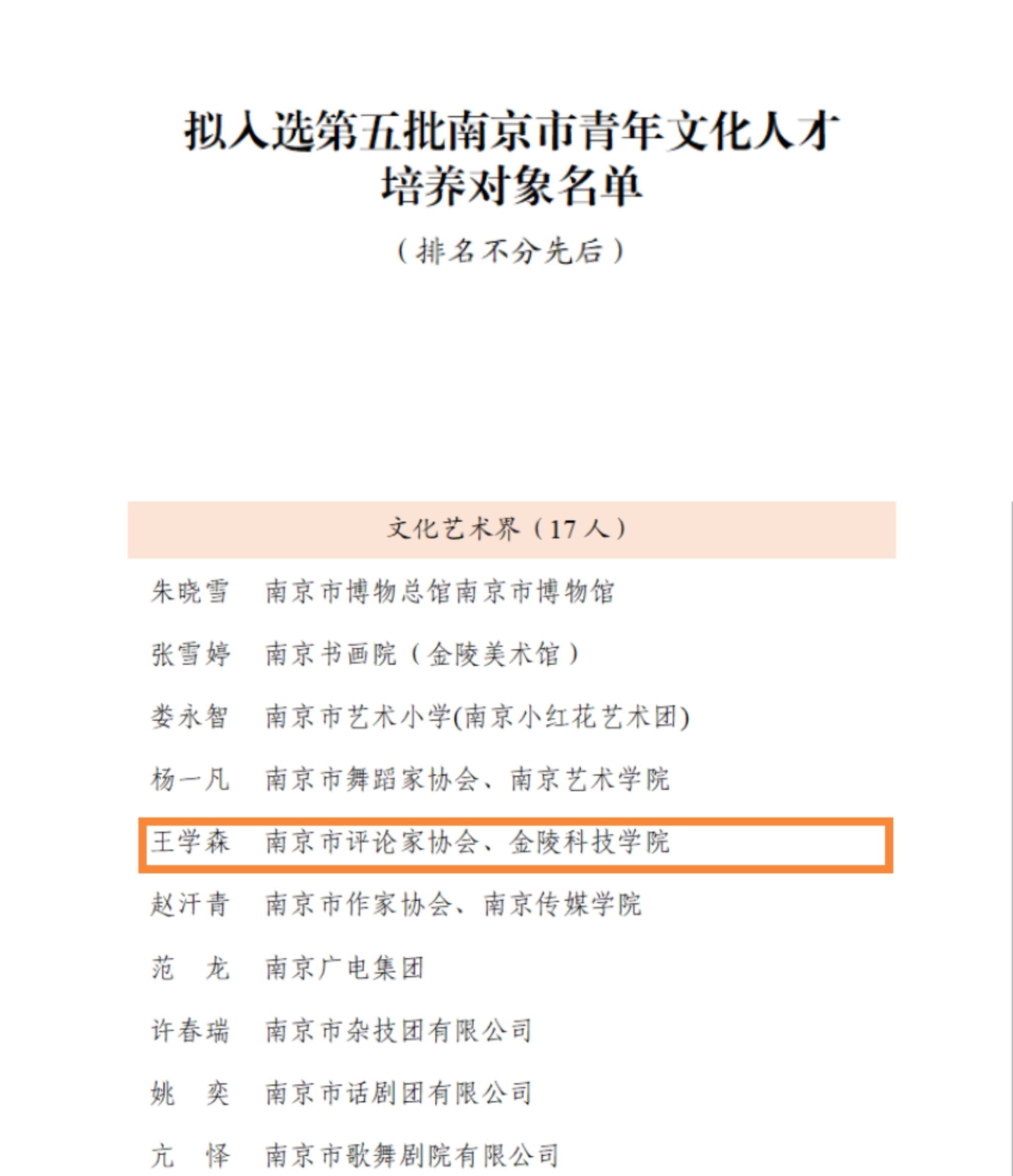 根据《关于开展南京市宣传文化系统第七批“五个一批”人才和第五批青年文化人才选拔培养工作的通知》精神,经个人申报、资格审核、单位推荐、专家评审、信息核查、市委宣传部研究等程序,sjb世俱杯人文学院王学森博士被遴选为第五批南京市青年文化人才培养对象。