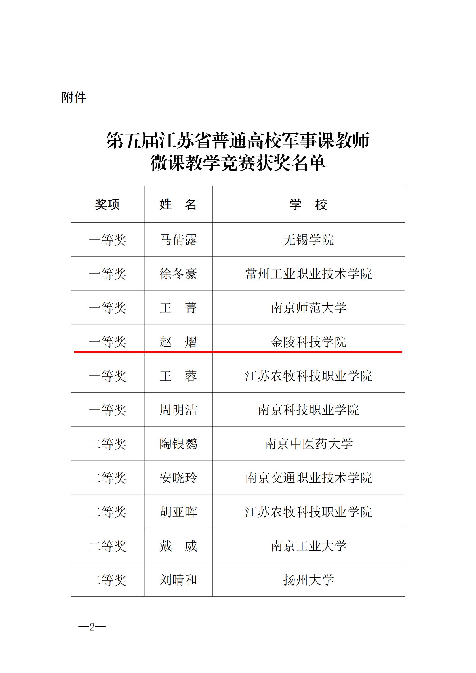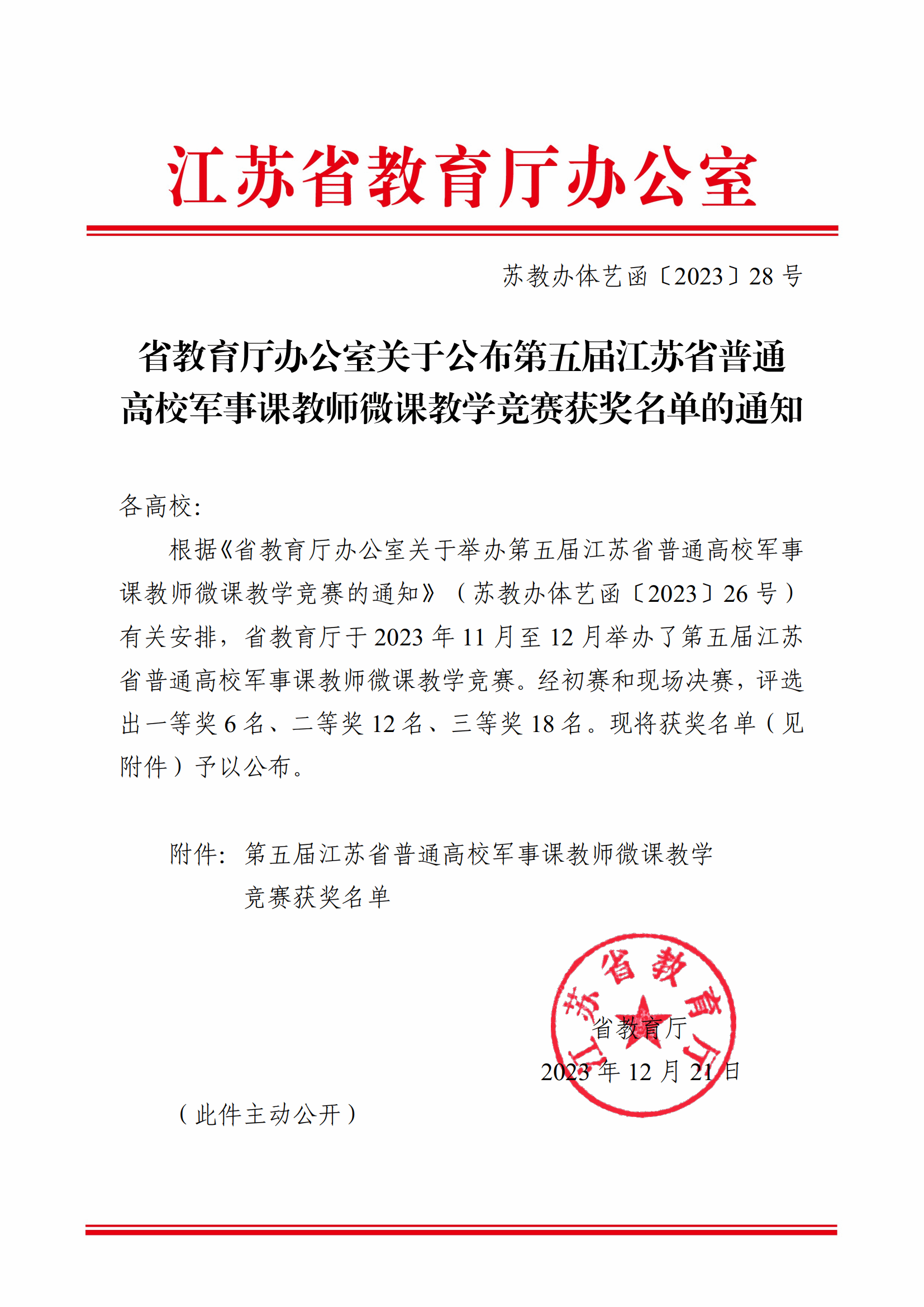 近日,江苏省教育厅发布《省教育厅办公室关于公布第五届江苏省普通高校军事课教师微课教学竞赛获奖名单的通知》,sjb世俱杯学生工作处赵熠老师荣获一等奖。