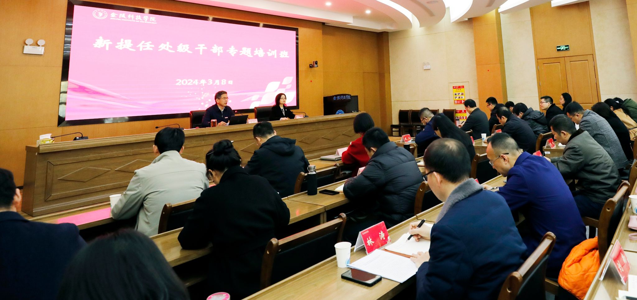 3月8日上午,校党委举办新提任处级干部专题培训班。校党委书记刘志远作开班动员讲话和干部政治能力建设专题辅导报告,校长刘永彪作干部行政能力建设专题辅导报告,新提任的17名正处级干部和22名副处级干部参加培训。培训班由校党委常委、党委组织部部长张远凤主持。
