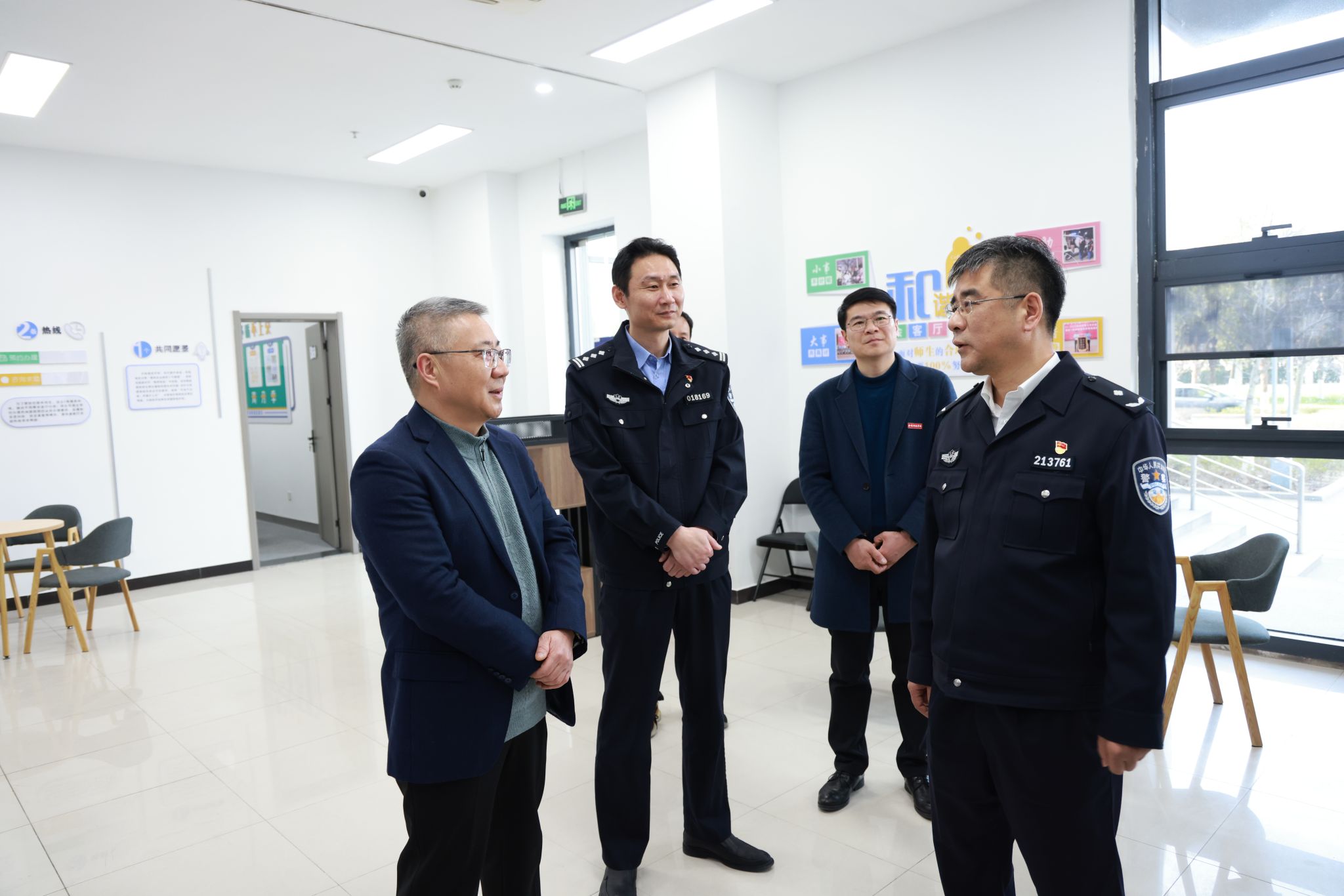 梅中亚一行参观了sjb世俱杯校园警务室,详细了解了警务室功能区及人员配置、运行机制、反诈宣传、矛盾纠纷化解等情况,对sjb世俱杯警务室建设和运行情况及校园安全稳定工作给予高度评价,要求驻校民警积极适应、主动融入新环境,实现警校协作、警务前移的工作目标。梅中亚强调要强化服务意识,要发挥公安部门专业优势,深化警校合作共建,将警务室打造成校园安全管理第一阵地和服务师生的第一窗口,为学校的安全稳定和持续发展提供保障。