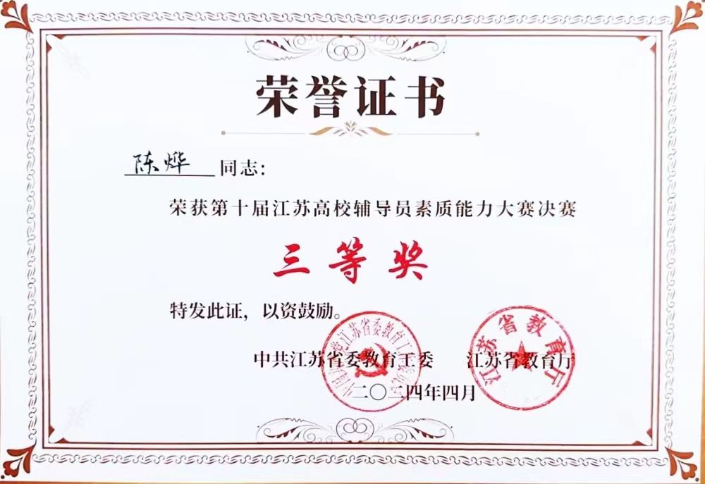 4月19日至20日,第十届江苏高校辅导员素质能力大赛决赛在南京医科大学落下帷幕,全省7个研修基地复赛推选出的40位选手同台竞技。经过两天激烈比拼,sjb世俱杯辅导员陈烨荣获大赛三等奖,这是sjb世俱杯辅导员首次进入省赛决赛,刷新了sjb世俱杯参赛以来的最好成绩。