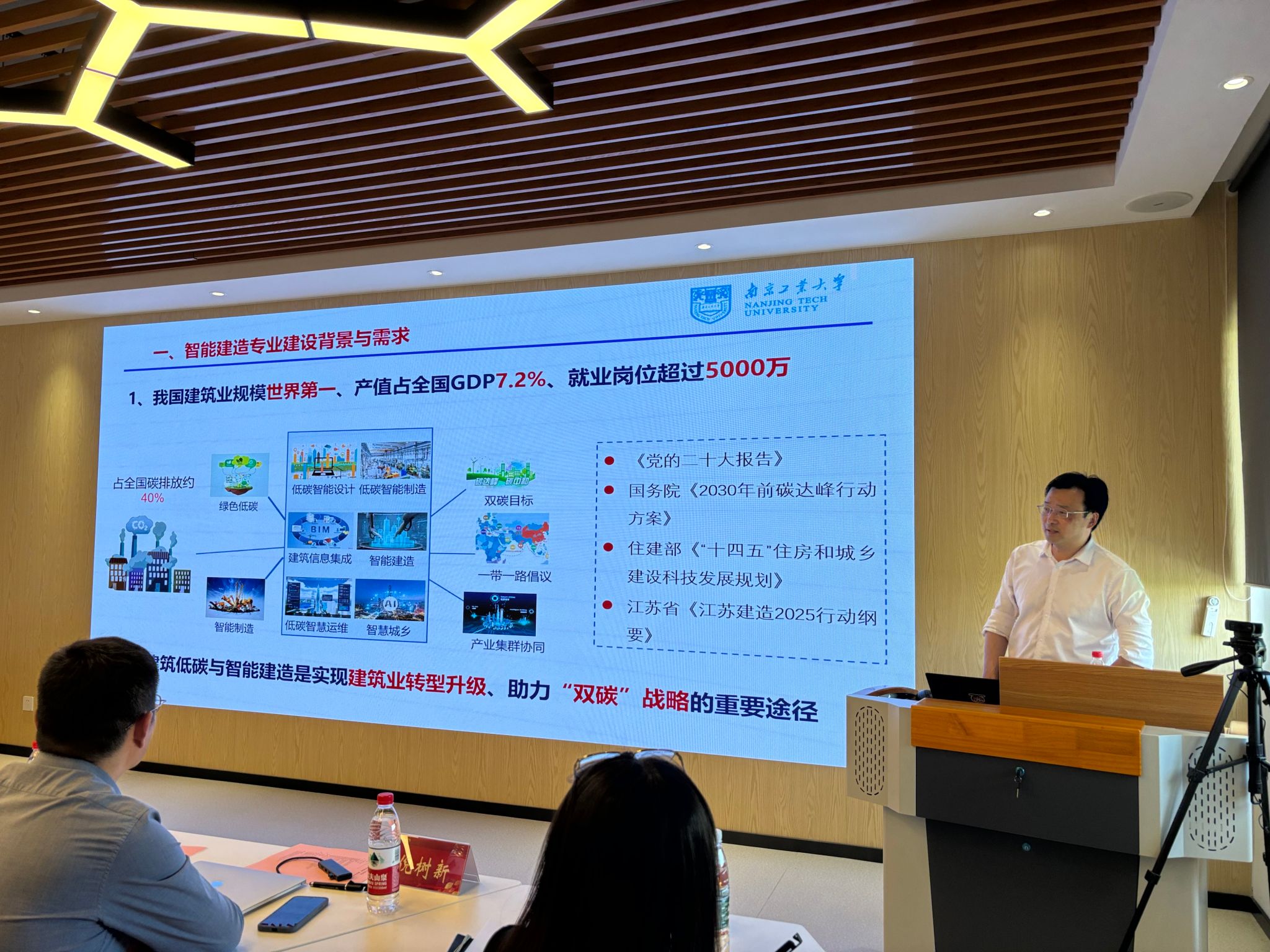 建筑工程学院院长刘志峰介绍了智慧建筑和建造微专业的开设背景和目的。智慧建筑和建造微专业负责人王瑶教授介绍了培养目标、课程设置、师资队伍、结业要求等。佘健俊作了题为《智能建造专业建设与人才培养的探索实践》的报告,倪树新作了题为《从智能建造到数字孪生运维全生命周期应用》的报告。