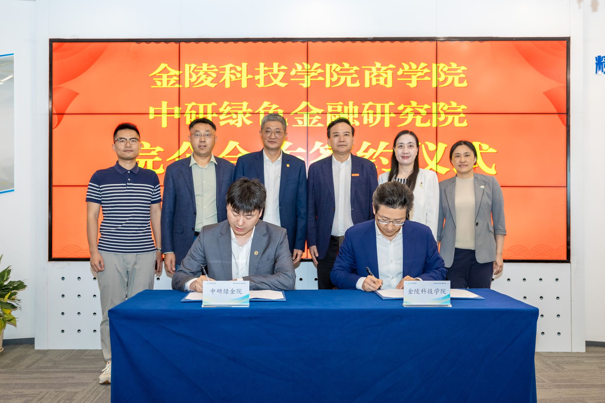 中研绿色金融研究院董事长、省金融业联合会副理事长束兰根,院长、省金融业联合绿色金融专委会秘书长顾蔚,副院长谈鑫、刘卢琰、王苏标等与刘永彪一行在专业优化调整、研究生国际化培养、绿色金融前沿研究与产业化应用、ESG指标设计与应用等方面进行了交流,并共同见证了中研绿色金融研究院与学校商学院签订校外实习基地协议。刘永彪指出,中研绿色金融研究院不仅是国内绿色金融专业研究和人才培训领域的一面旗帜,也逐渐成为对接国际优质资源和宣传我国“双碳”实践的重要窗口。刘永彪强调,双方不仅可以围绕碳汇核算、碳资产评估、绿色金融产品开发等方面开展高级别的人才培养、培训的合作,还可以聚焦南京产业强市战略和数字技术赋能绿色发展合作开展研究,共建长江双碳经济发展研究院智库,助推南京市“4266”产业体系加快建设和绿色转型发展。