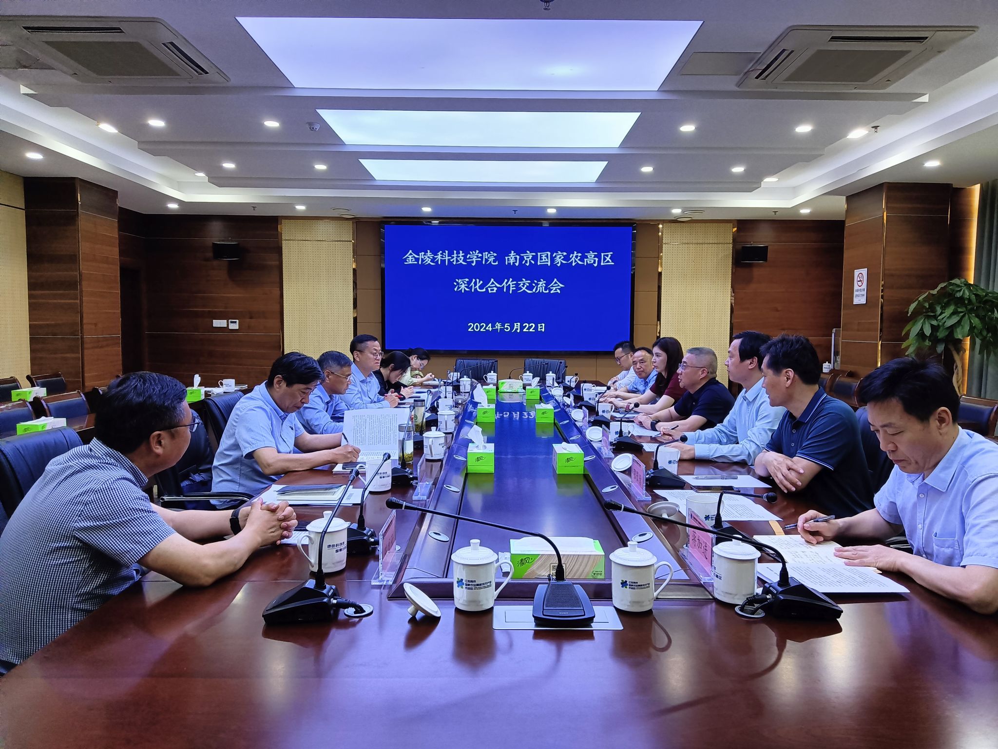 5月22日下午,副校长高永祥带队赴南京国家农业高新技术产业示范区进行调研交流。溧水区政府党组成员刘人祥带领白马高新区管委会副主任王新铭、区农业农村局副局长葛庆松及区科技局、白马镇相关负责人接待了高永祥一行。